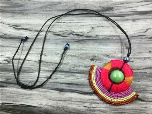 This is a multicolored charm necklace with a green bead, a perfect accessory with your beachwear.