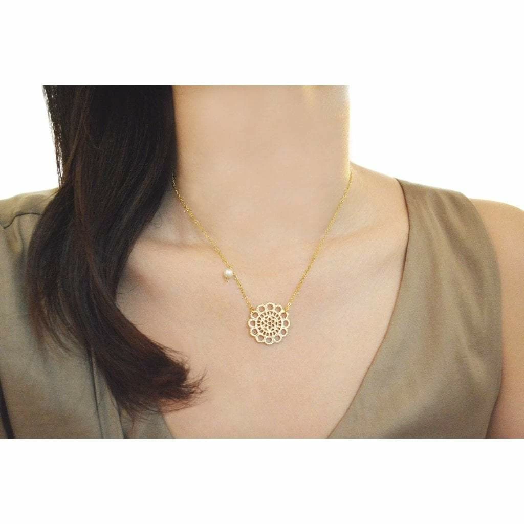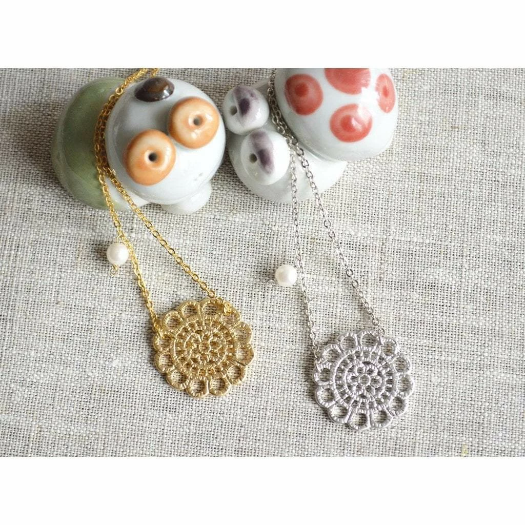 This lace pendant necklace with a small pearl closes with a spring buckle. 16″ long, simple, elegant, and perfect for everyday. You can choose longer (up to 18”) with NO additional fee. All made from 16K Gold plated, Tarnish resistant, Nickel FREE material.
