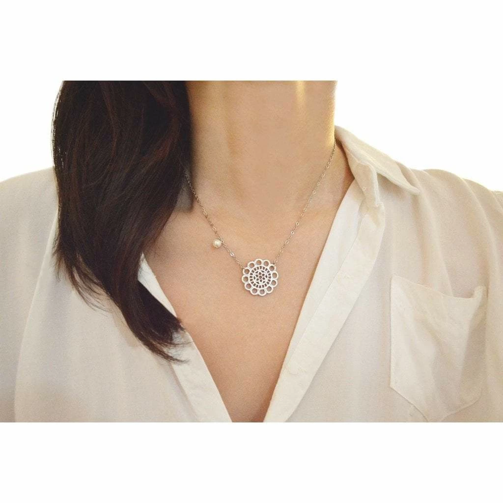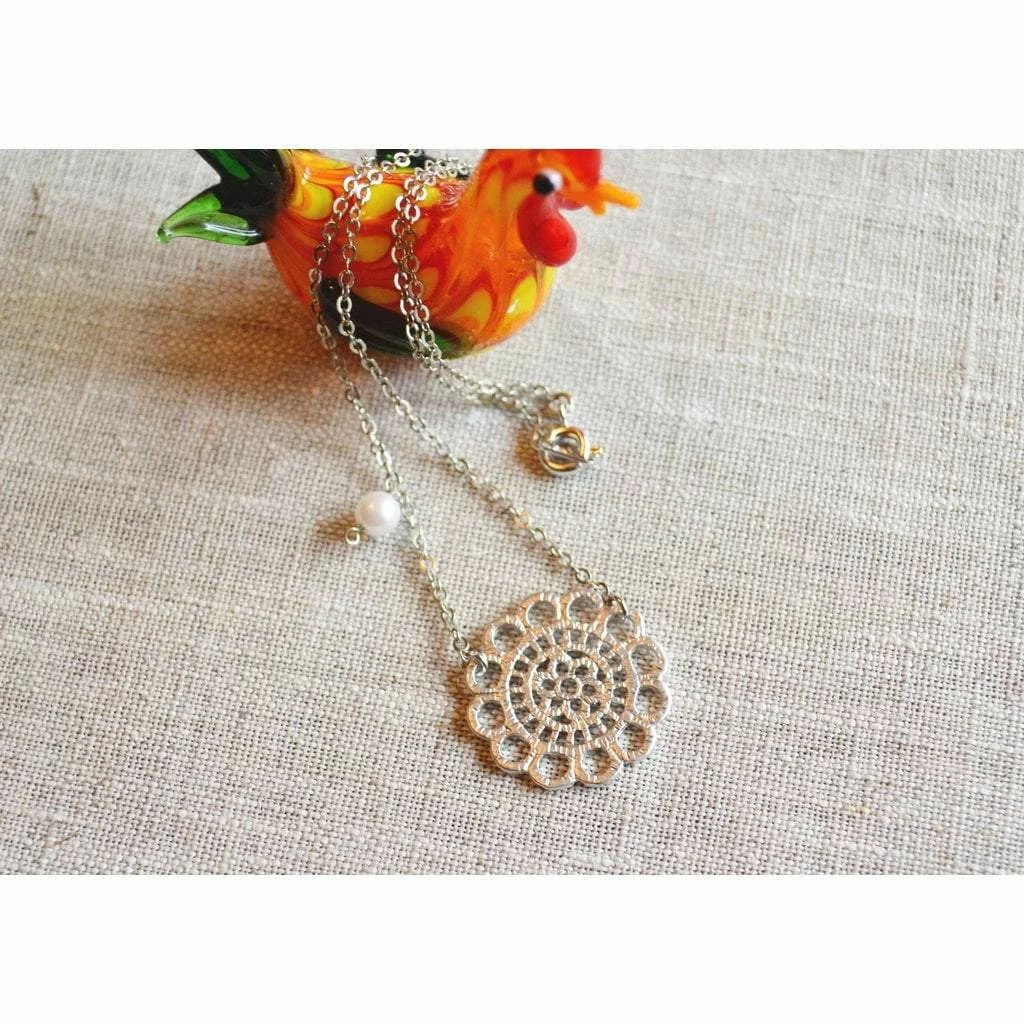 This lace pendant necklace with a small pearl closes with a spring buckle. 16″ long, simple, elegant, and perfect for everyday. You can choose longer (up to 18”) with NO additional fee. All made from White Gold plated, Tarnish resistant, Nickel FREE material.