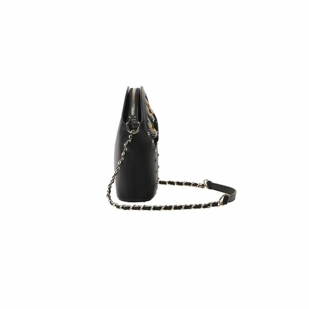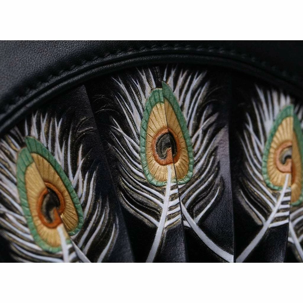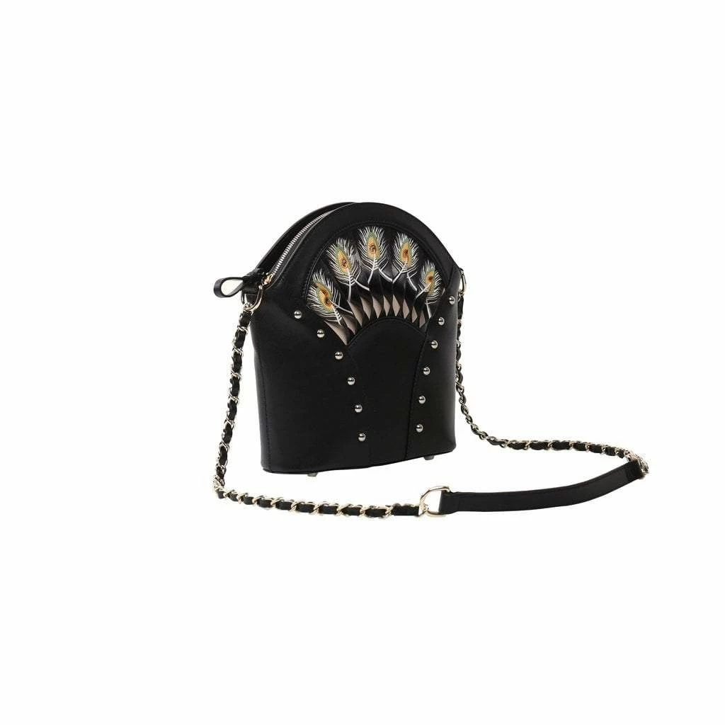 In black leather, the image of a peacock inspired our designers to create dimensional feathers in this sophisticated peacock silhouette. This stunning shoulder bag will carry all of your essentials in immeasurable style. With roomy zippered interior and attached shoulder strap.