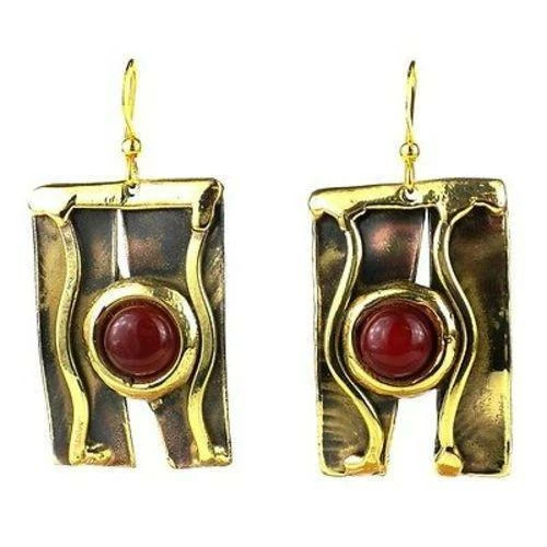 South African artisans create by hand these dynamic brass earrings adorned with carnelian stones that hang from brass hooks. The brass coloration is achieved by applying high heat rather than paints or dyes.Dimensions: 20 mm wide x 30 mm long.