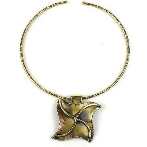 Handcrafted in South Africa, this necklace is comprised of a 2-inch tall brass pinwheel pendant with a self bale and a 15-inch long hammered open brass hoop. The pendant’s coloration is achieved with high heat rather than paints or dyes.