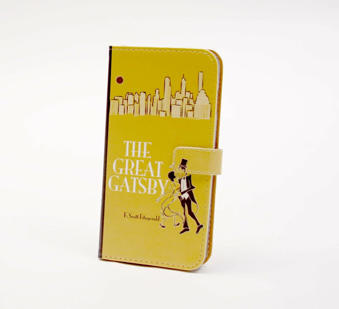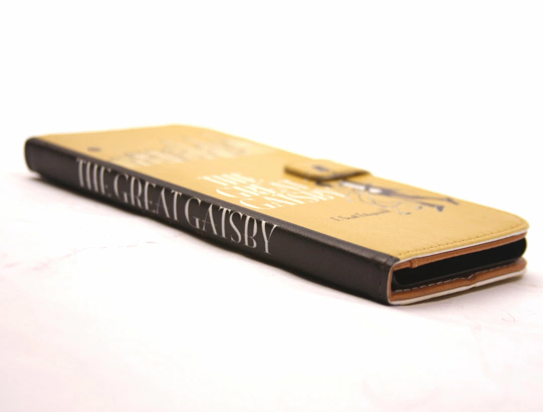 Great Gatsby flip iPhone/Samsung Galaxy phone wallet case. PU leather with yellow and black illustrations. Made to resemble a book.