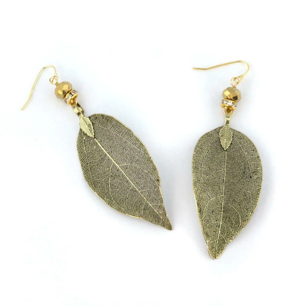 Christy Jean’s new Favorite earrings! They are so beautiful and lightweight. Made with real leaves that are dipped in gold or colored electroplating then hand crafted by our designer!