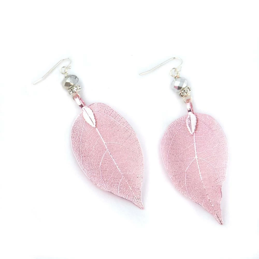Christy Jean’s new Favorite earrings! They are so beautiful and lightweight. Made with real leaves that are dipped in silver or pink electroplating then hand crafted by our own designer!