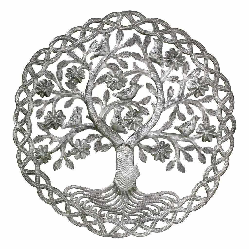 This 24 inch Tree of Life features leaves, flowers, and bird. Hand cut and embossed in Haiti by local artisans from recycled steel oil drums. Suitable for indoor or outdoor use. Measures approximately 24 inches in diameter.