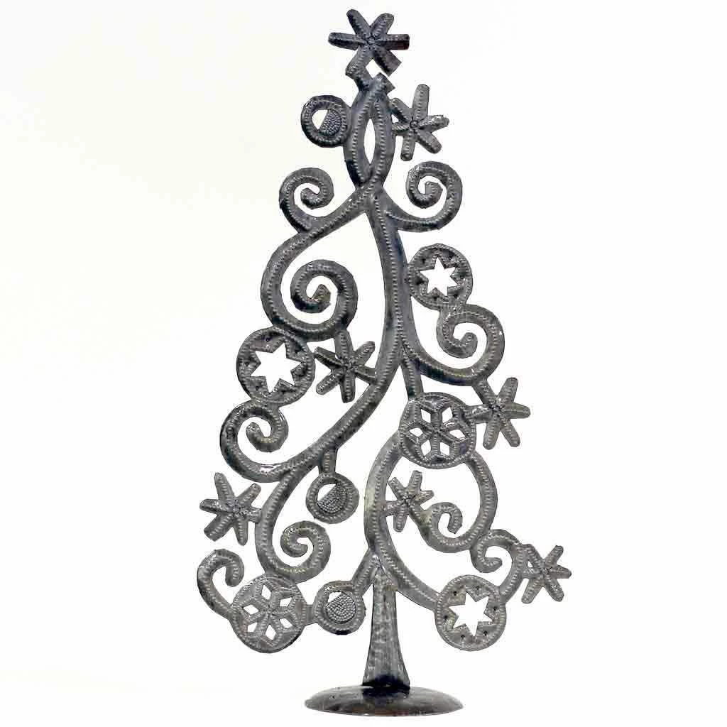 Tabletop Christmas tree features a swirling design with cascading stars and snowflakes. Hand-cut and embossed from steel drums by Haitian artisans. It measures approximately 14″ x 7.5″.