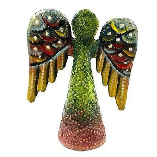 This metal art holiday angel is 4 inches tall, perfect for decorating your desk or topping a tiny tree. Handmade from steel drums and brightly painted.