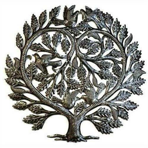 This intricate wall piece made from recycled oil drums in Croix des Bouquets, Haiti, features a traditional Tree of Life design handcrafted by Carlo Brutus. 24 inch diameter with a natural patina with high gloss finish. Suitable for indoor or outdoor hanging.