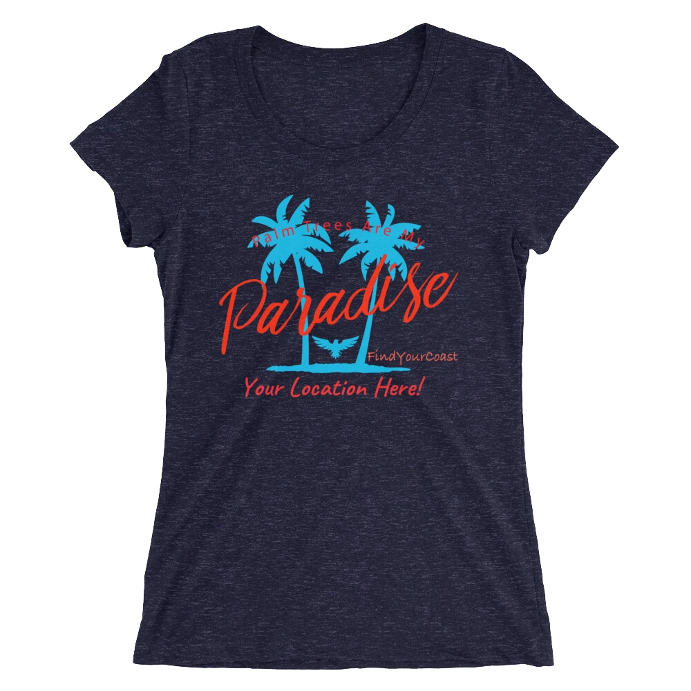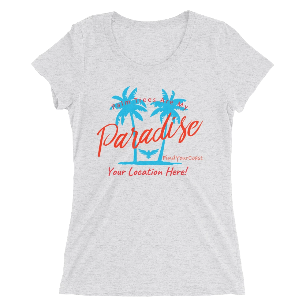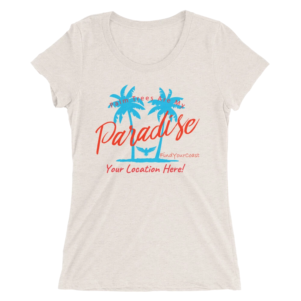 A super-soft, form-fitting, breathable t-shirt with a slightly lower neckline than a classic t-shirt. Personalize this tee shirt with your very own favorite paradise. Try the personalize feature today! Â Just enter your favorite paradise and we do the rest before shipping.
