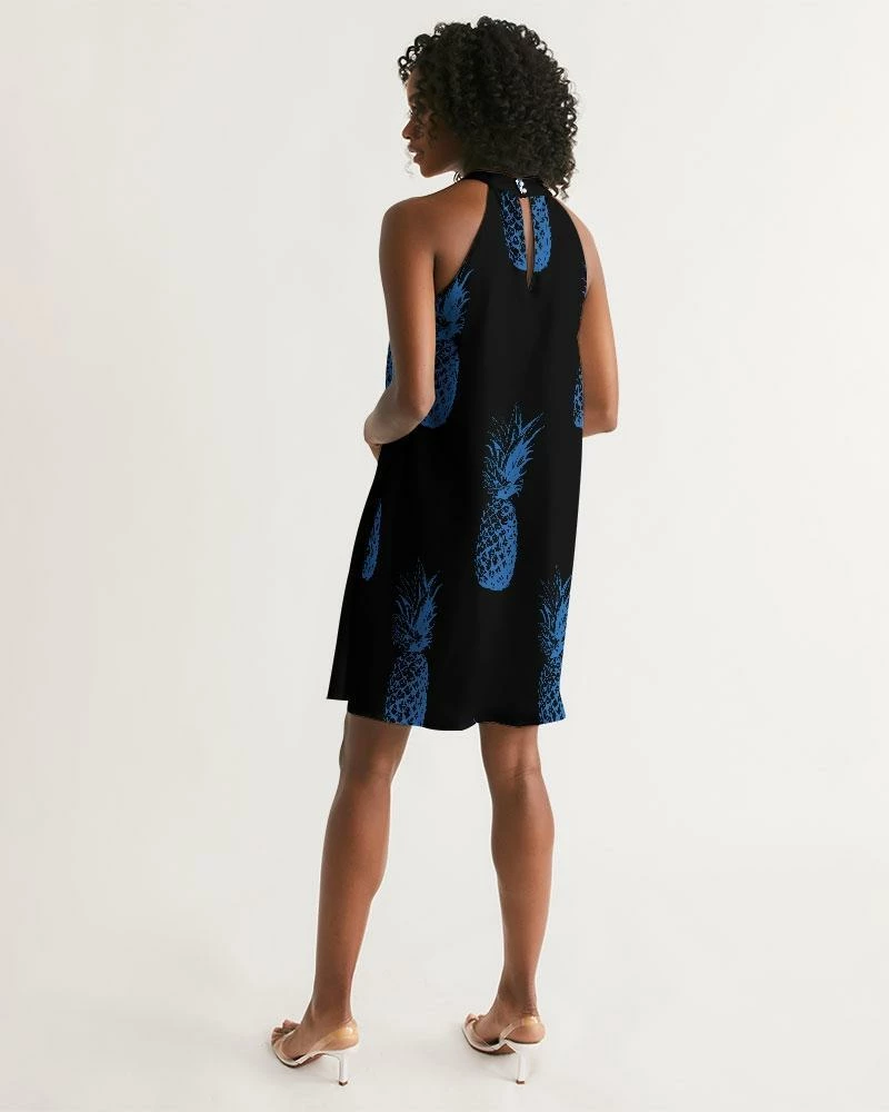 About The ArtPineapples by Find Your Coast Supply Co. Product DetailsElegant yet simple, you will look phenomenal in our Women’s Halter Dress. Handmade from polyester chiffon material and fastened in the back with two chic pearl buttons.