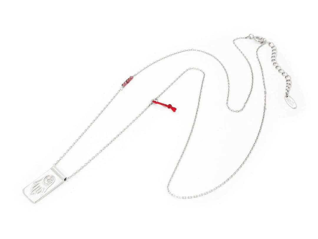 A delicate chain in 925 sterling silver accentuated by a Fronay Collection signature Hamsa Hand Plaque sparkled with a brilliant cubic zirconia. A designers choice necklace, this piece includes a spiritual red cord and natural amethyst briolette stones.