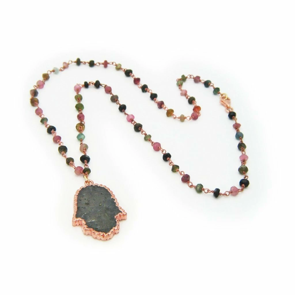 Handmade spiritual necklace featuring a designer Hamsa Hand crafted out of natural labradorite stone all set on a 18 inch chain filled with natural tourmaline stones.