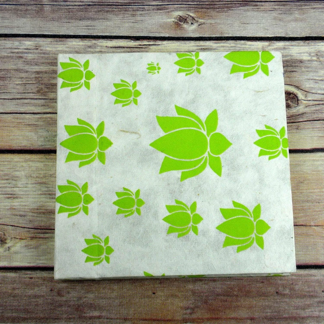 The Lotus journal is filled with 16 pages of hand made eco-friendly mulberry paper and has a screen-printed cover. Size: 5″ x 5.5″.