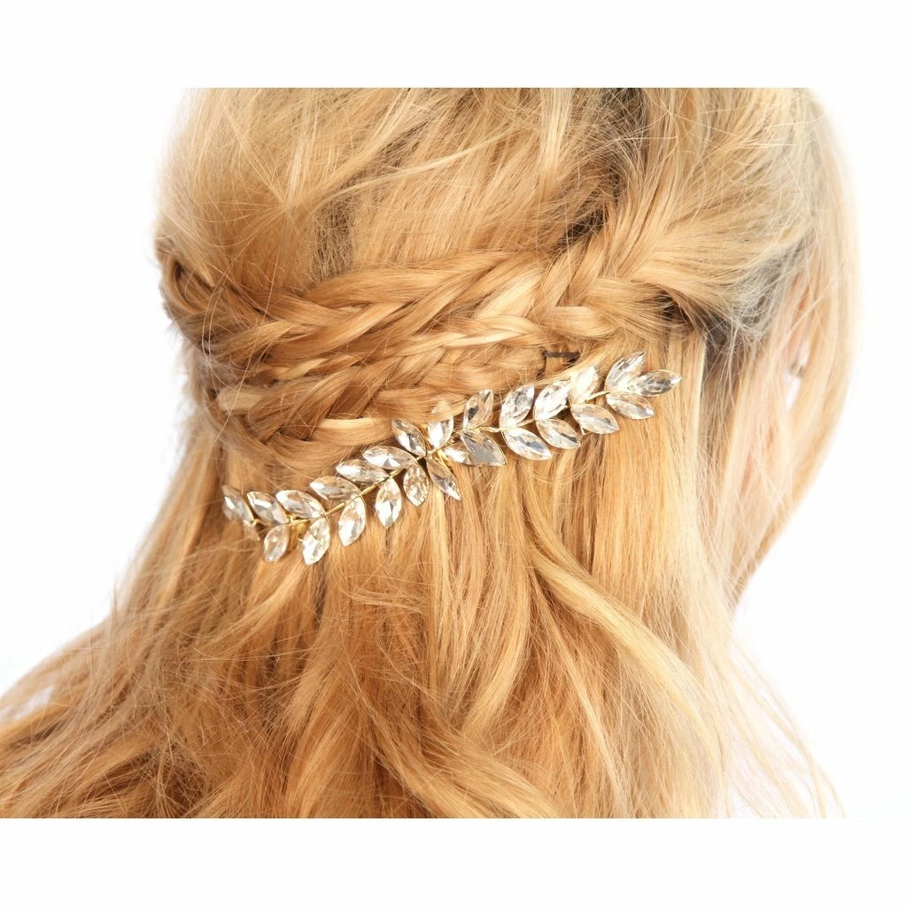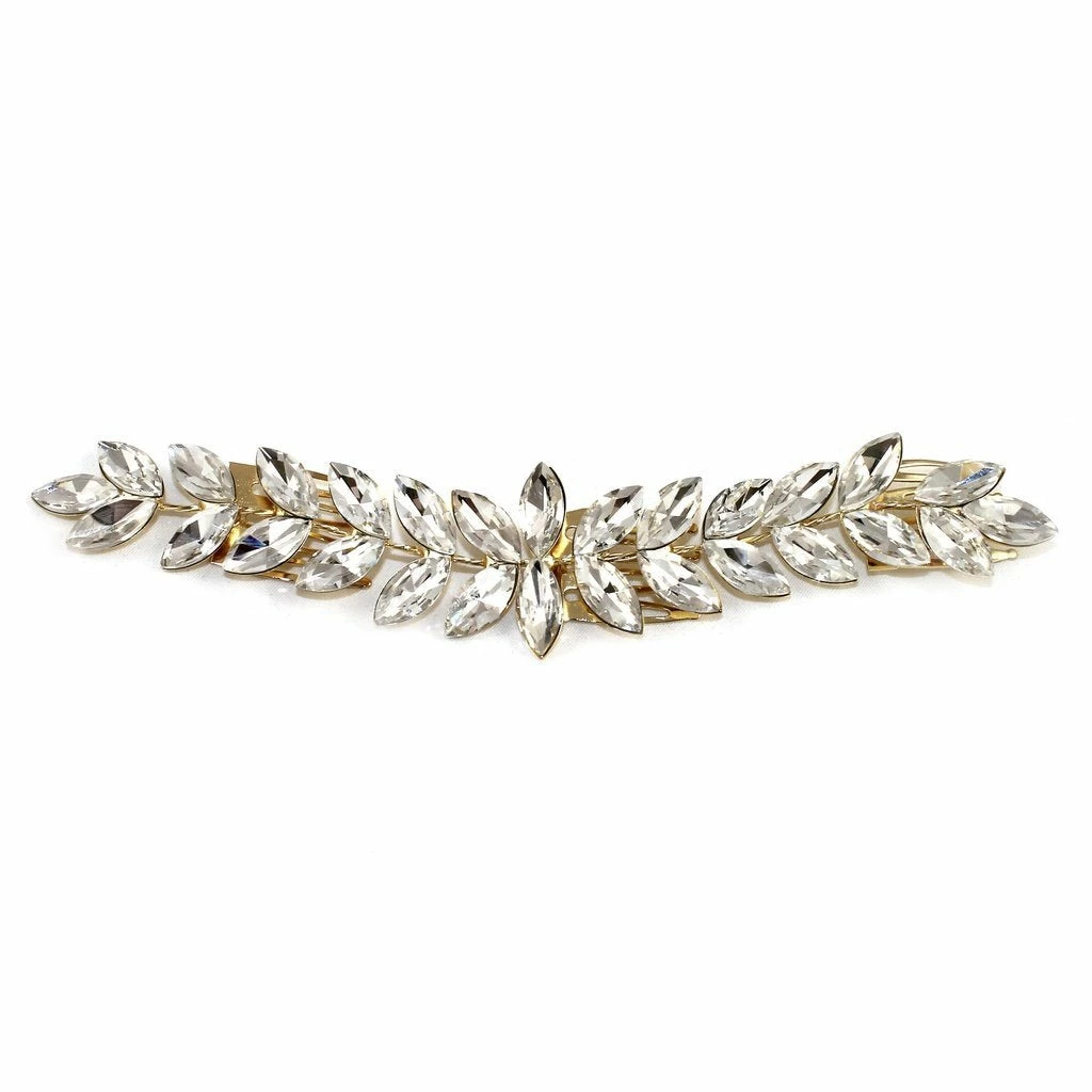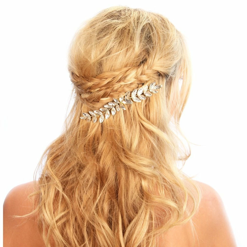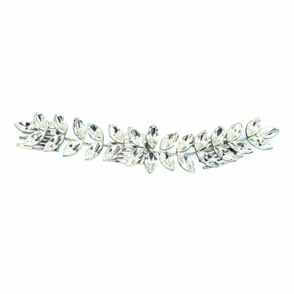 This piece was inspired by the 1920’s. The crystal embellished leaf design sits atop 3 metal combs. The wired leaves can be bent in whichever direction you prefer and are covered in sparkling glass crystals.