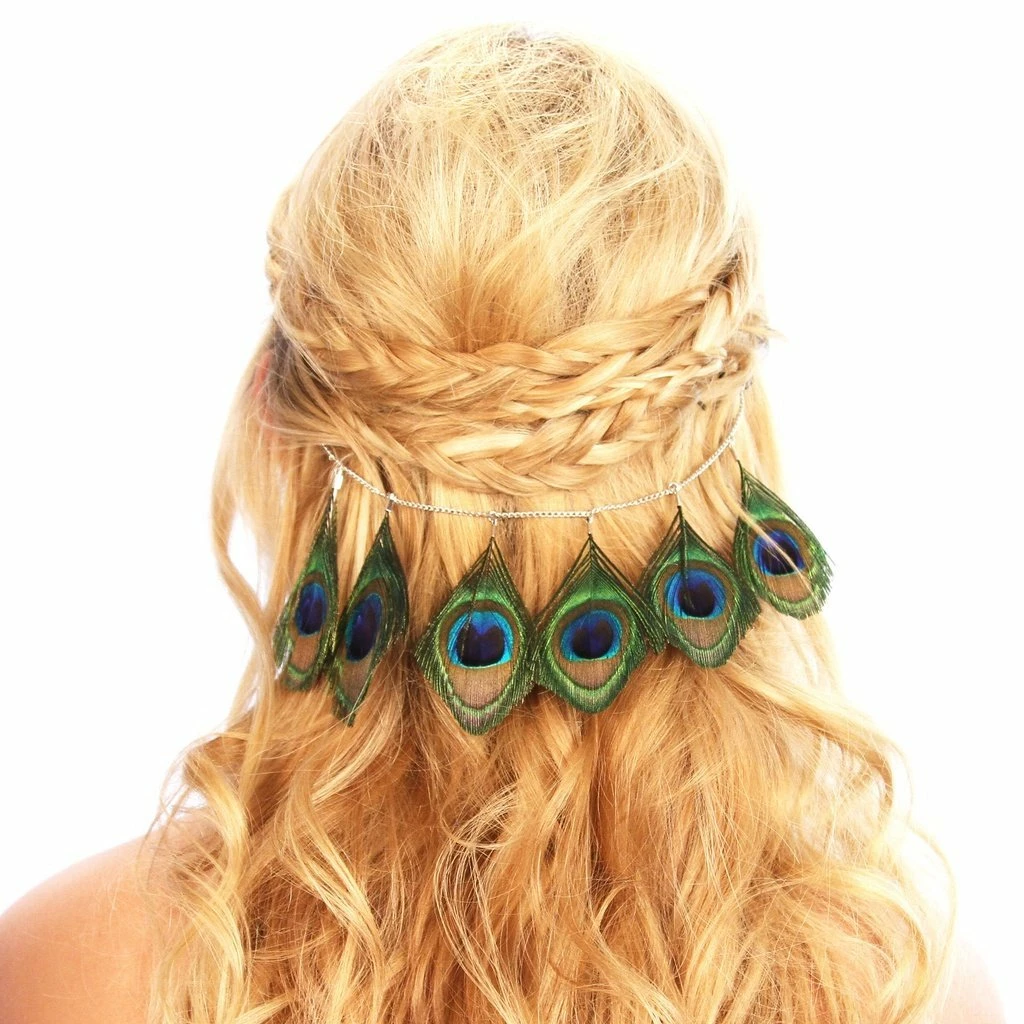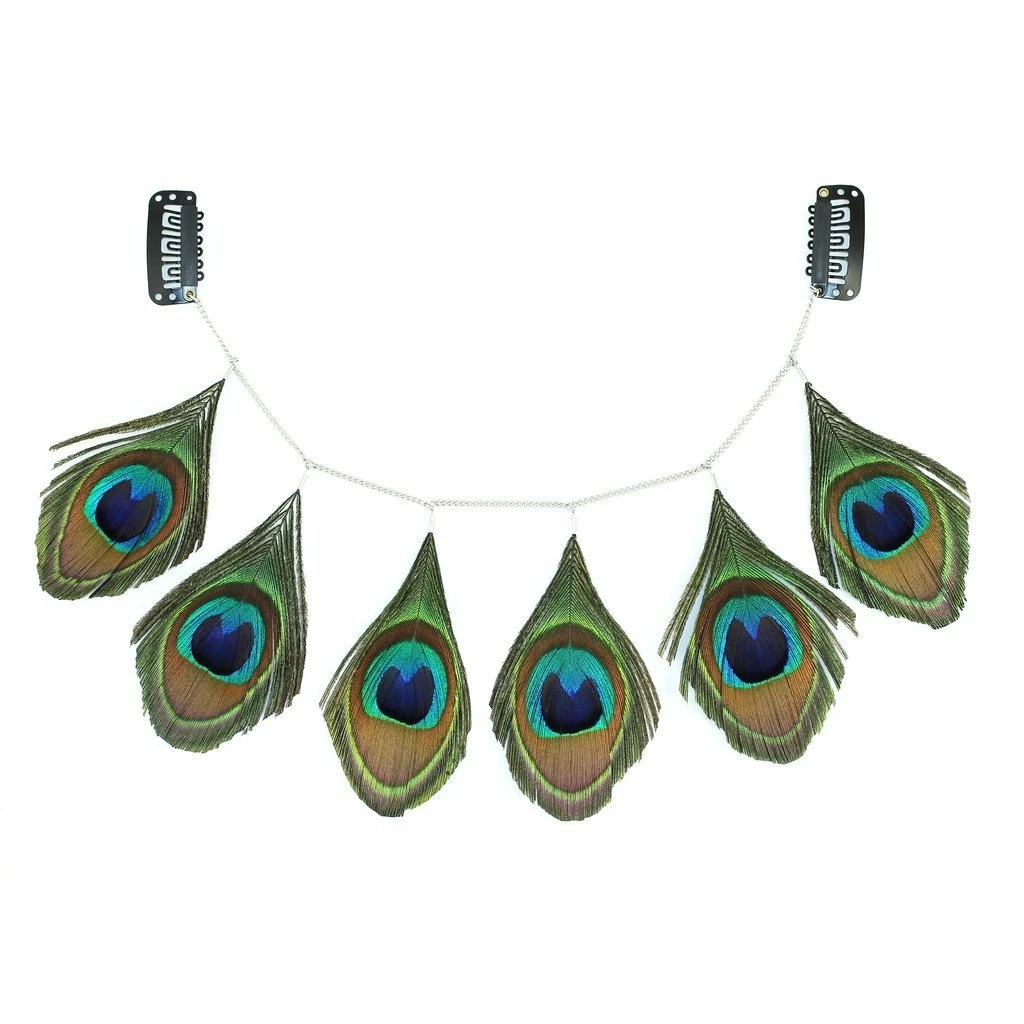 This festival inspired piece adds glamour and style! It features a rhodium plated steel chain with 6 natural peacock feathers hanging at the back. Two metal clamps on each end make this a wear with everything piece!