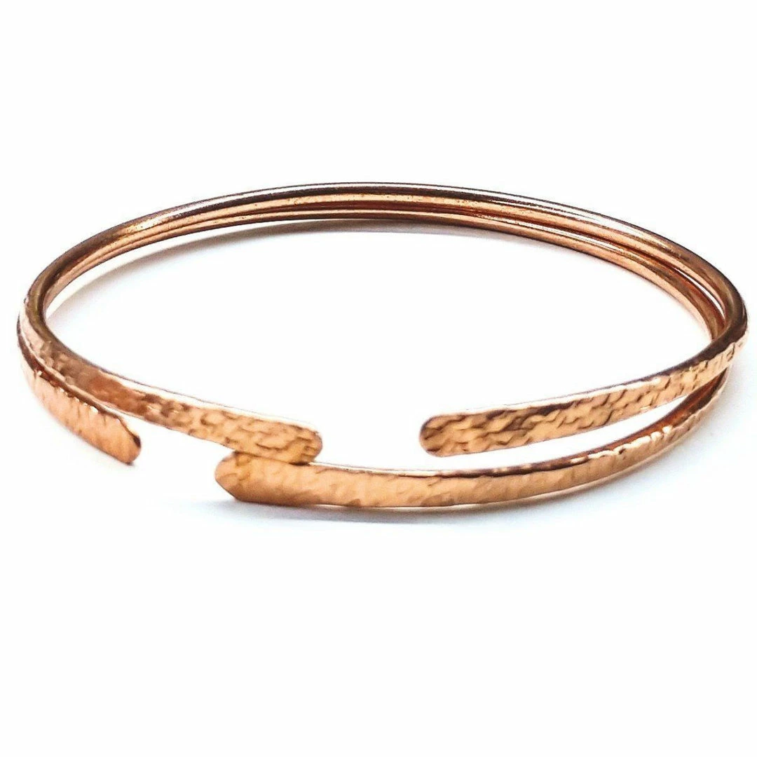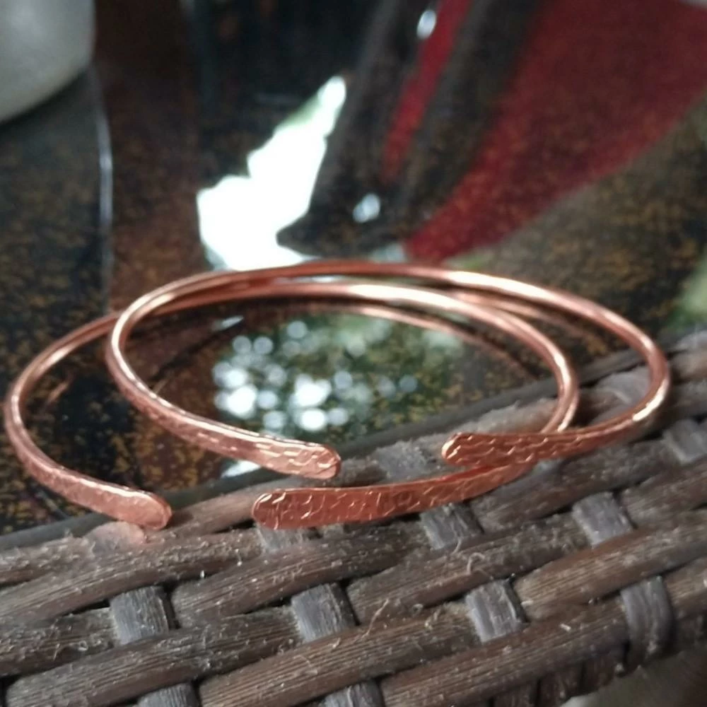 Buy our classic elegant shiny bare copper bangles, which you can wear single or stacked. Each is crafted by hand and made from 12 gauge solid bare copper wire, which ends the artist hammers flat and decorated with a certain hammered pattern. Each of the bangles is, therefore, a tiny bit different.