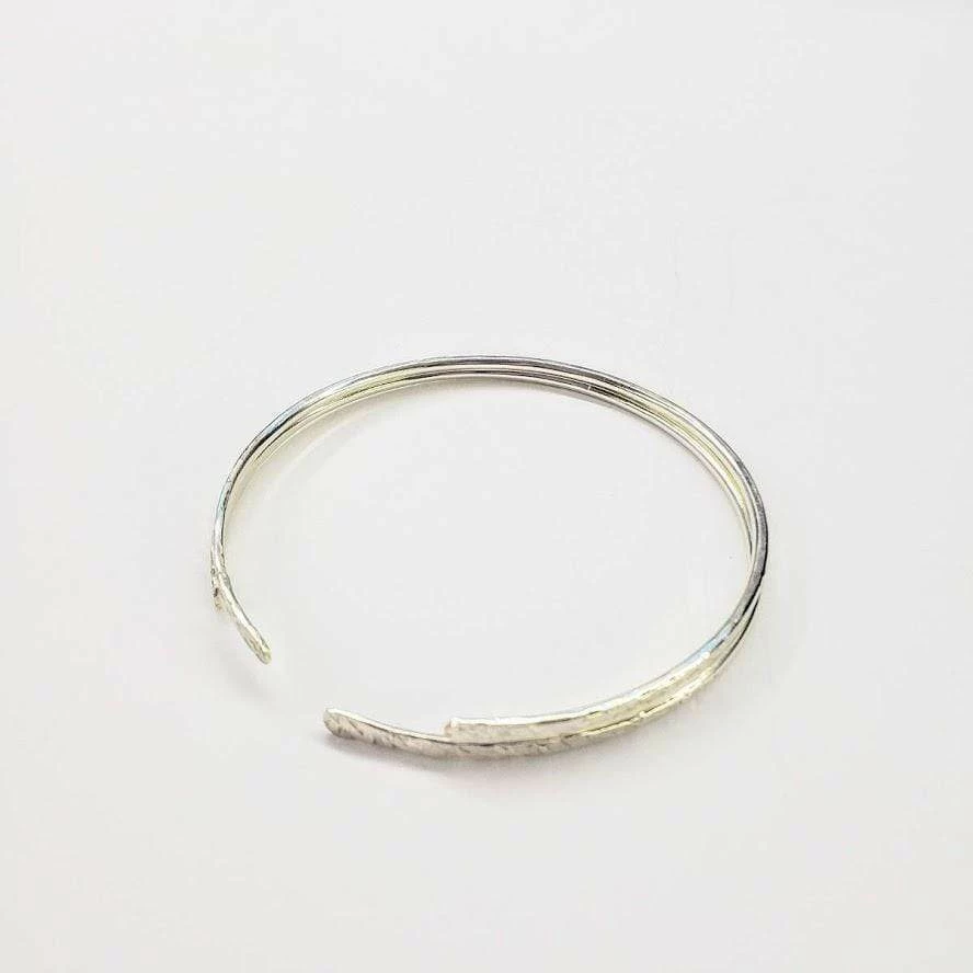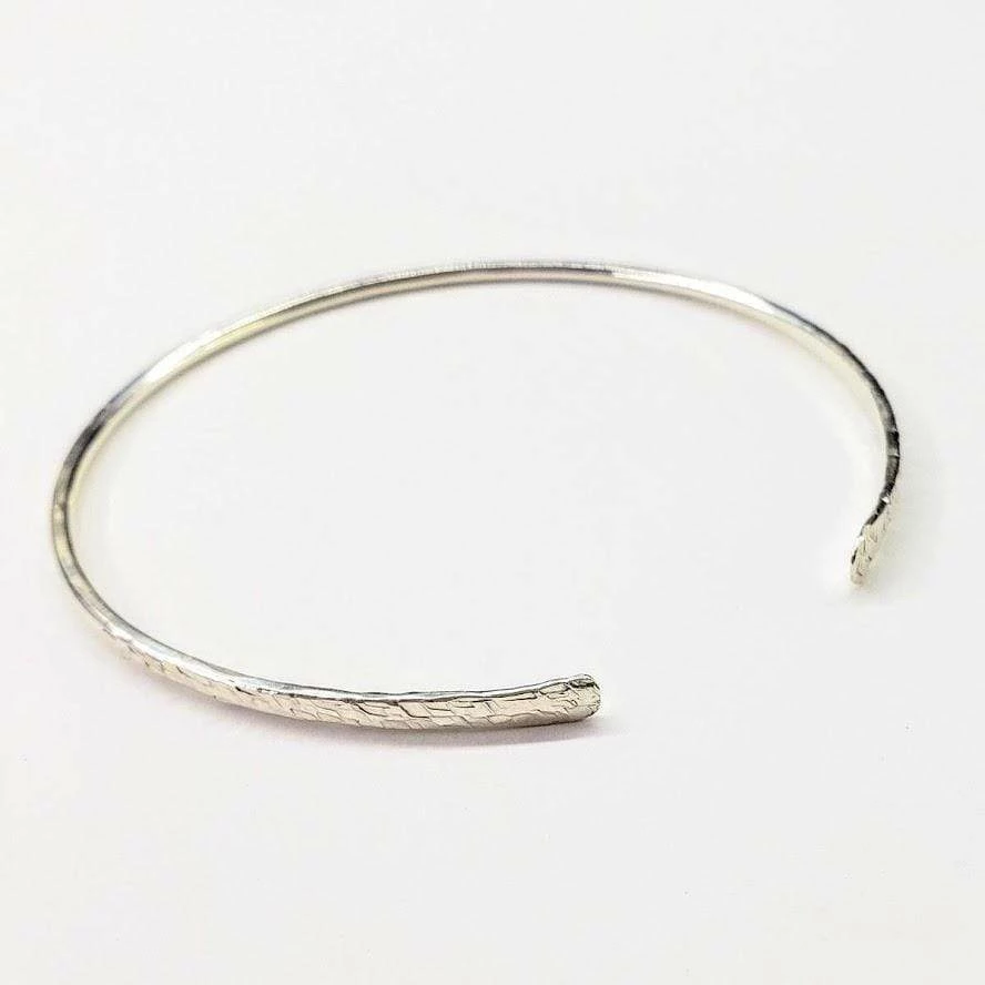 You will love these elegant handcrafted sterling silver open bangles. Each bangle is uniquely made from 12 gauge sterling silver wire. The handmade open bangles feature tapered decorative hammered ends which are sanded smooth. The bangle fit an up to 7-inch wrist. Wear them stacked or single!