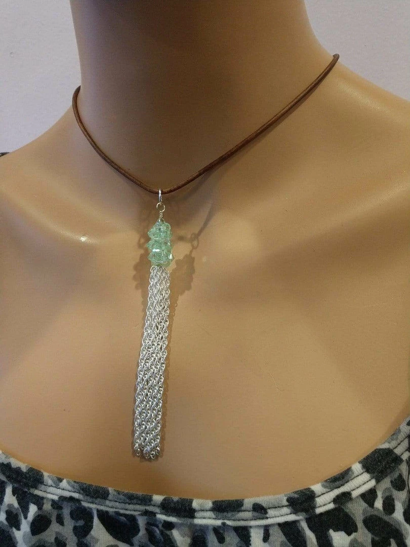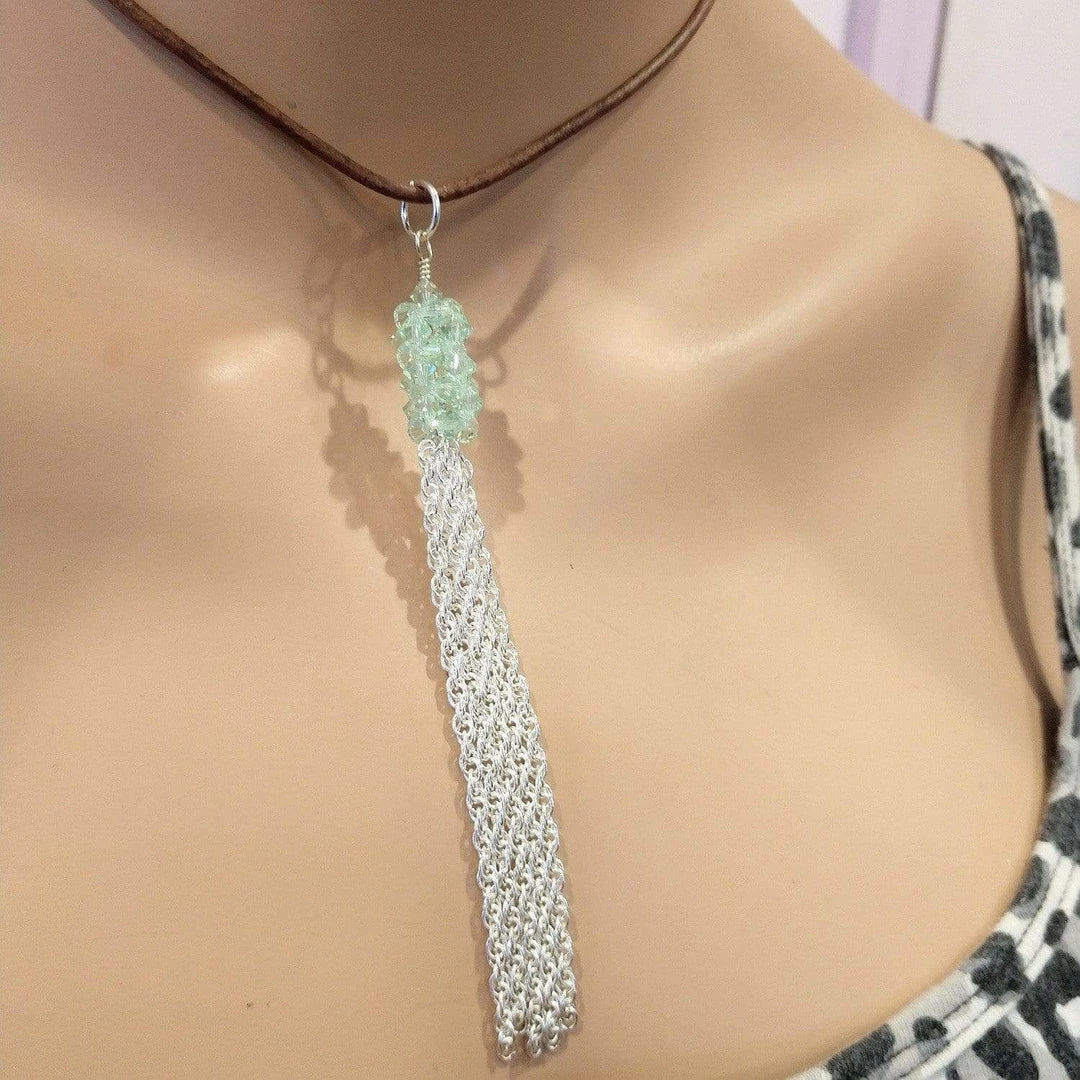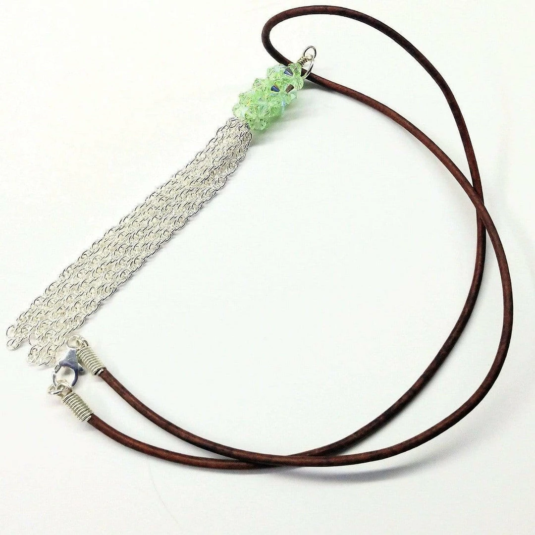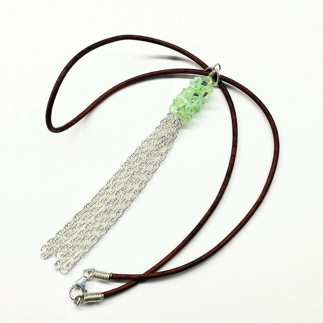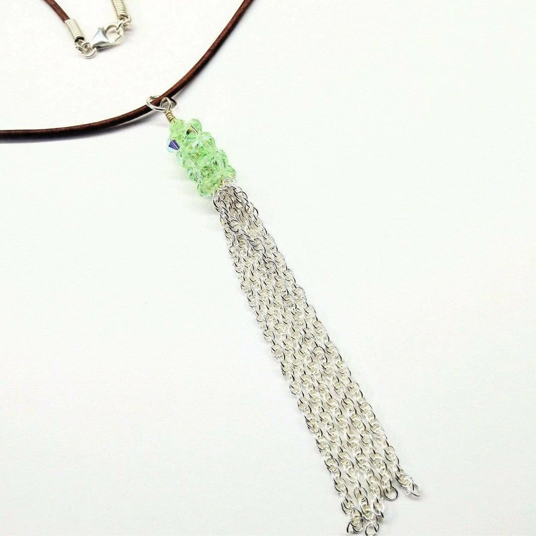 Stylish handmade long crystal barrel sterling silver tassel choker necklace. This cool choker necklace features a sparkly chrysolite AB Swarovski crystal bead woven barrel with a long five silver rope chain tassel. The handcrafted barrel tassel comes on a leather chain necklace which features hand coiled sterling silver end caps. Choker length is 16inches. optional 2-inch extension chain available.
