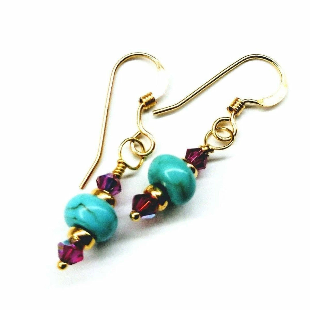 Handmade beautiful bright colored hot pink and turquoise 14 kt gold filled earrings. Each earring features a turquoise Heishi bead with golden spacer beads and fuchsia pink Swarovski Crystals. The length of the earrings is 1 1/4 inches. They are sure to make an outfit pop.