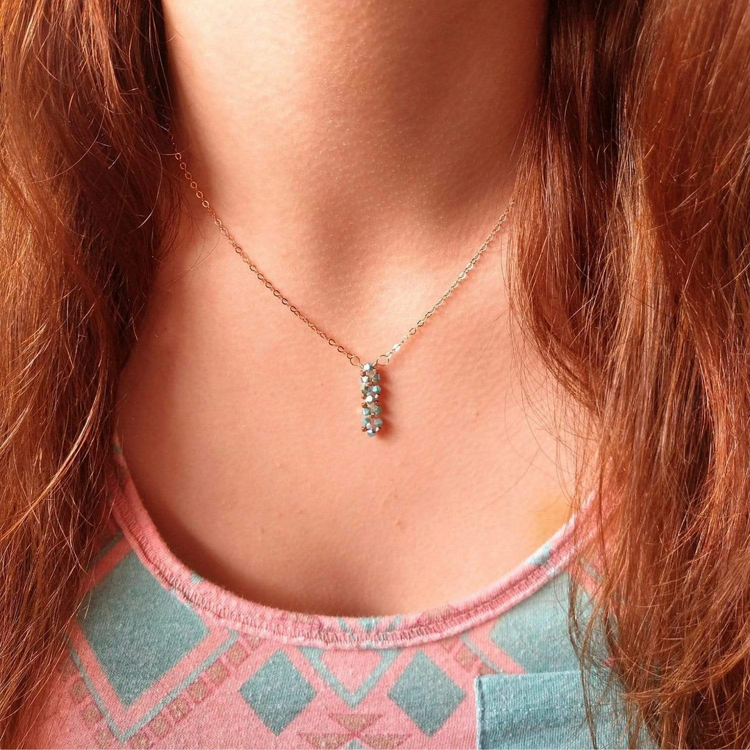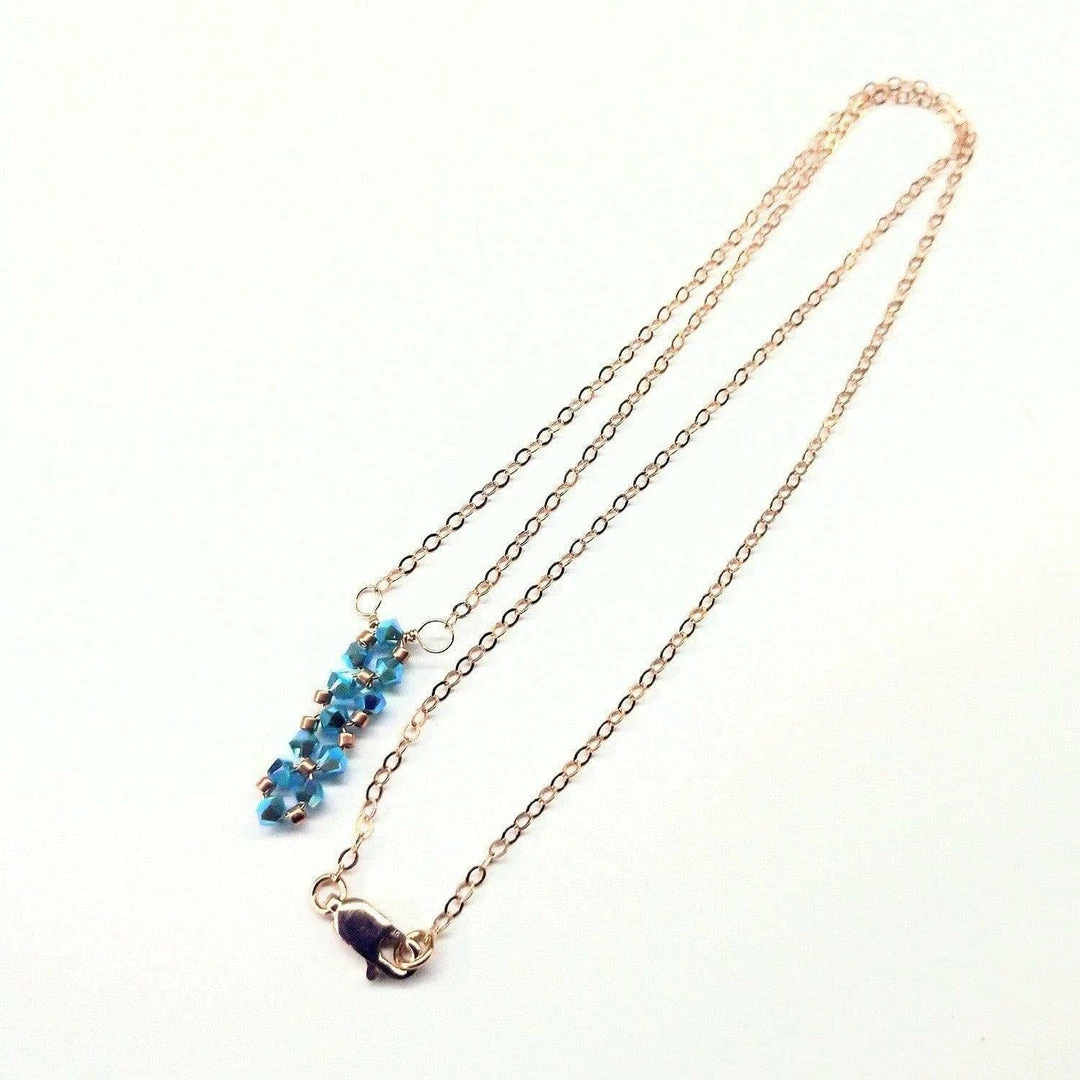 Gorgeous dainty handcrafted super sparkly Vertical Crystal Bar Necklace. This handmade necklace feature 11 super sparkly Turquoise ABx2 Swarovski Bicones which are wire bead woven with 14 kt rose gold filled into a tiny vertical crystal pendant. The super sparkle facets of each bicone reflect the light perfectly. The dainty yet sturdy vertical pendant is united with a precious 14 kt rose gold filled cable chain, Necklace is 18 inches long and features a lobster clasp closure.