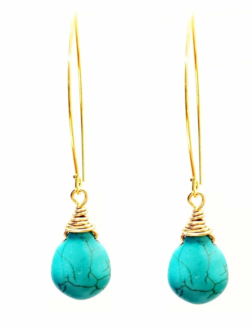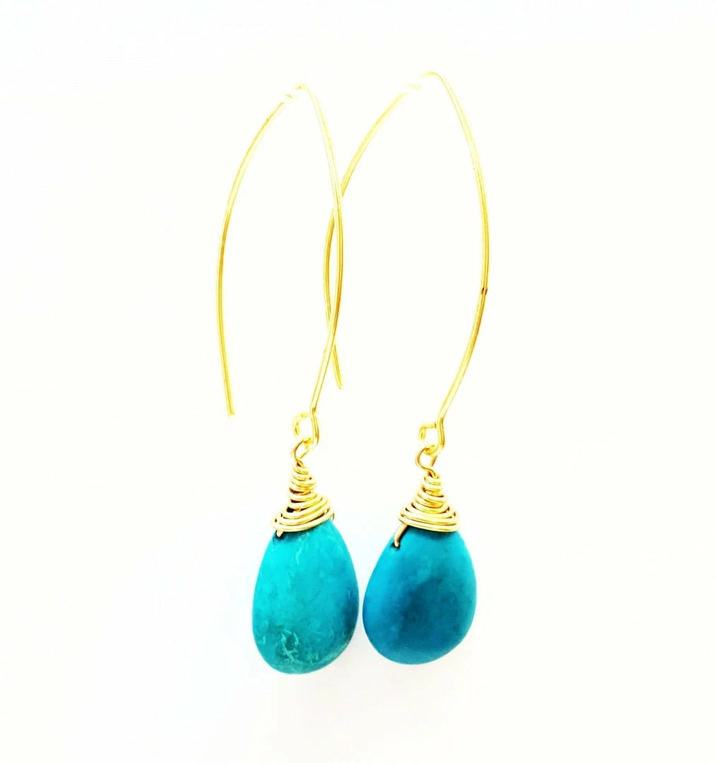 Drop chandelier style. Turquoise with gold plated accents with long ear wire. 2 inches long. Pierced.