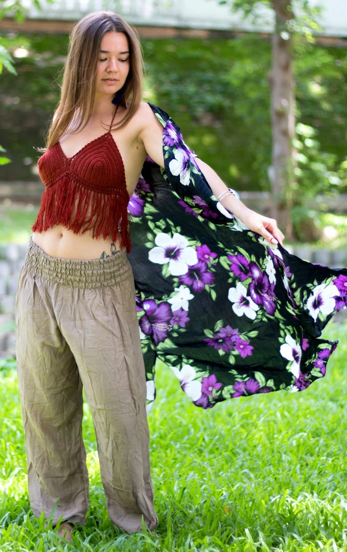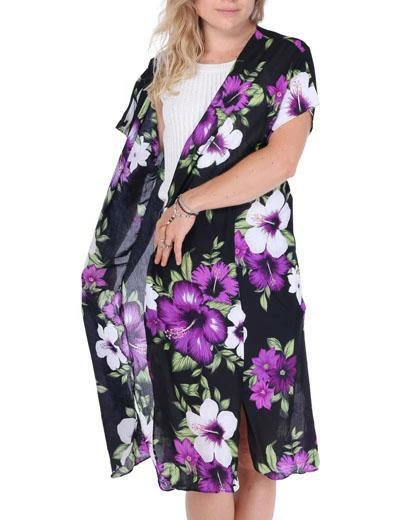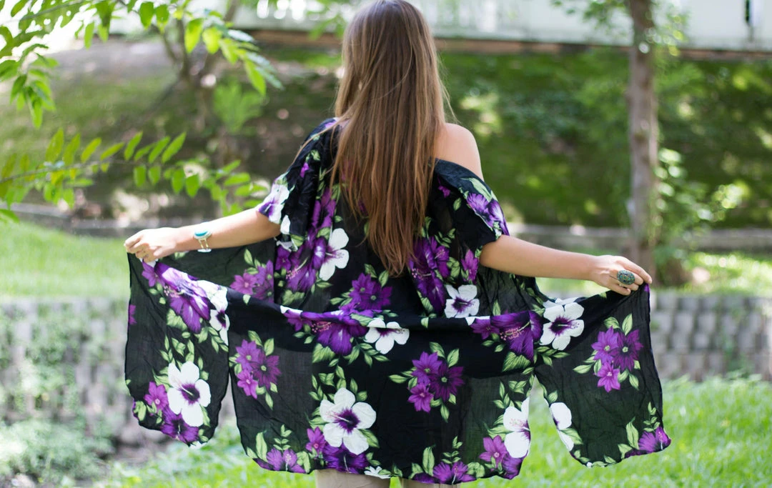 Hop onto the floral summer jacket trend with this Purple & Black floral kimono that will make you the center of attention on the festival circuit. Team it with denim shorts and a tank top to wow everyone around you.Â