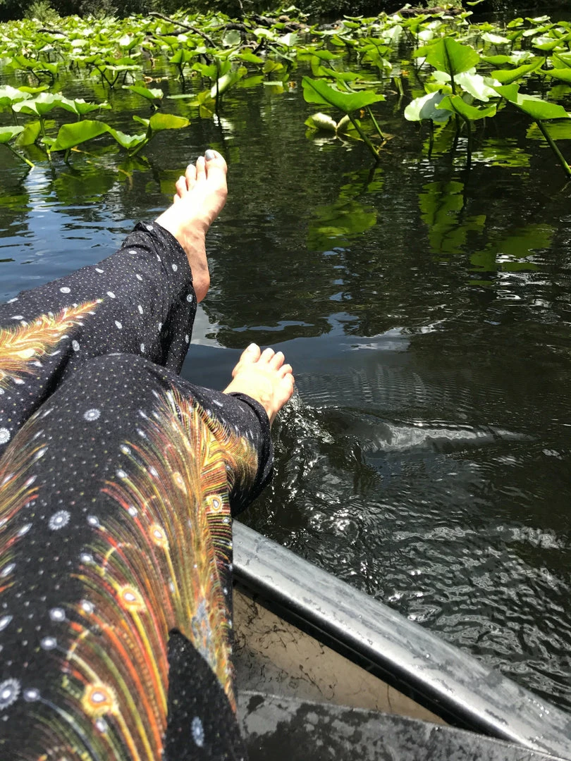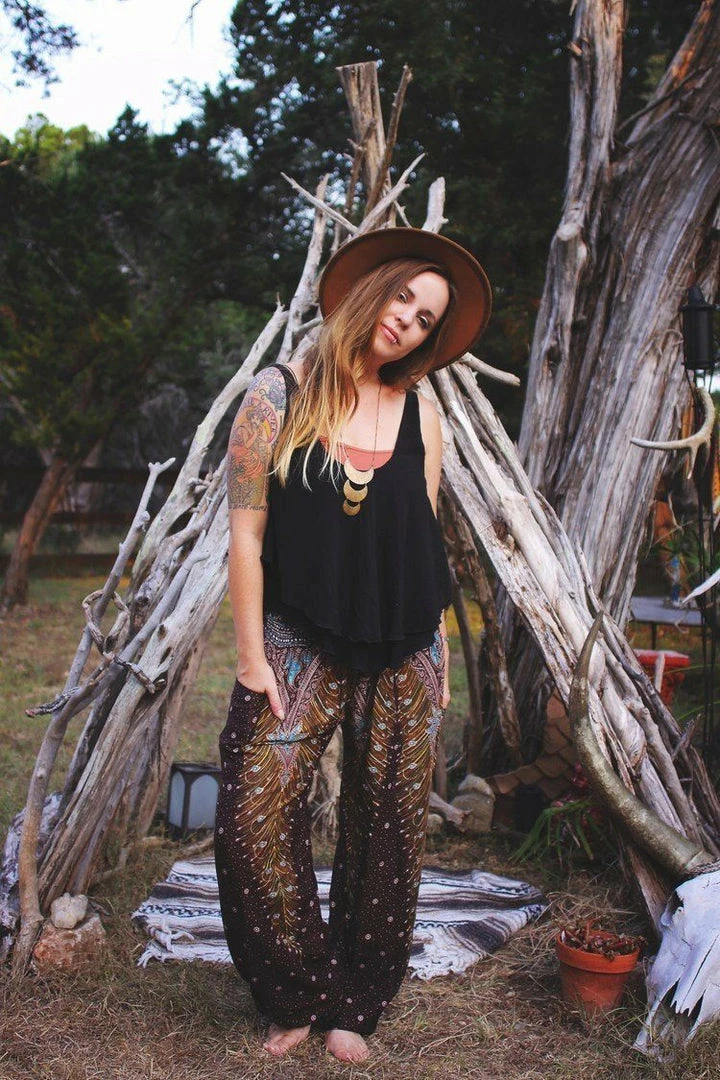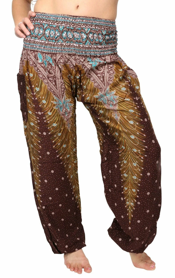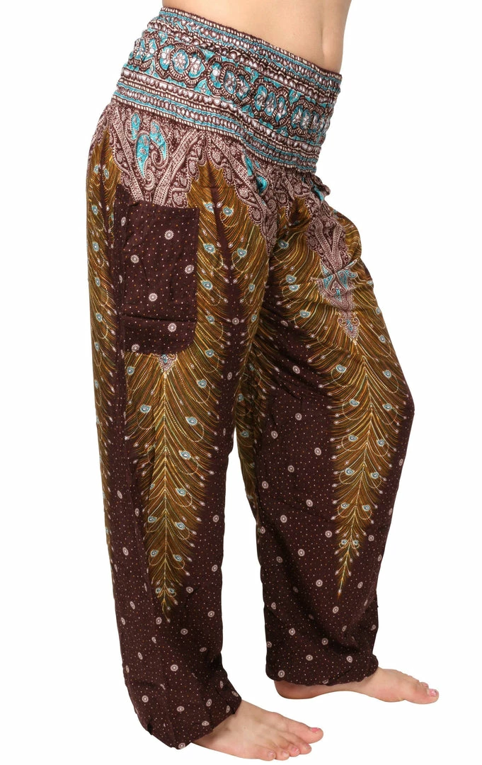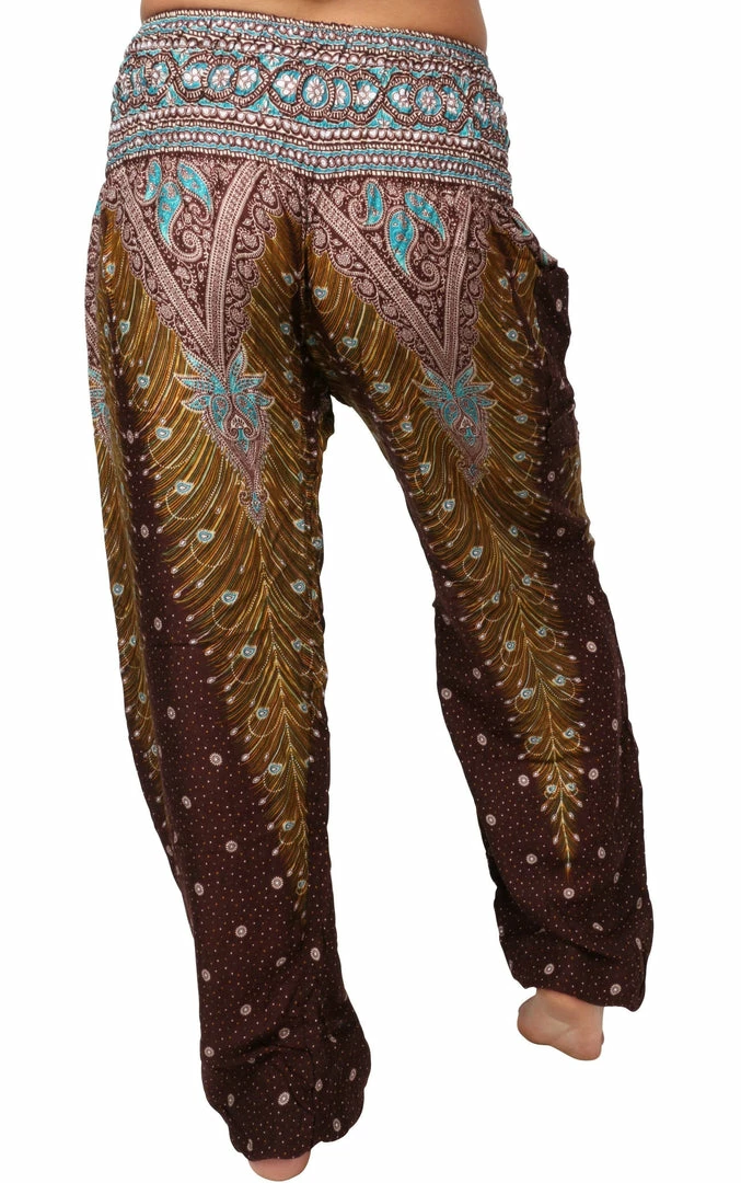 Our stunning, handmade Peacock harem pants underscore individuality. Donned with vivid shades of yellow and teal, and accented in bright white, these brilliant brown peacock print harem pants will be sure to accentuate the free spirit of the adventure-lover who wears them.
