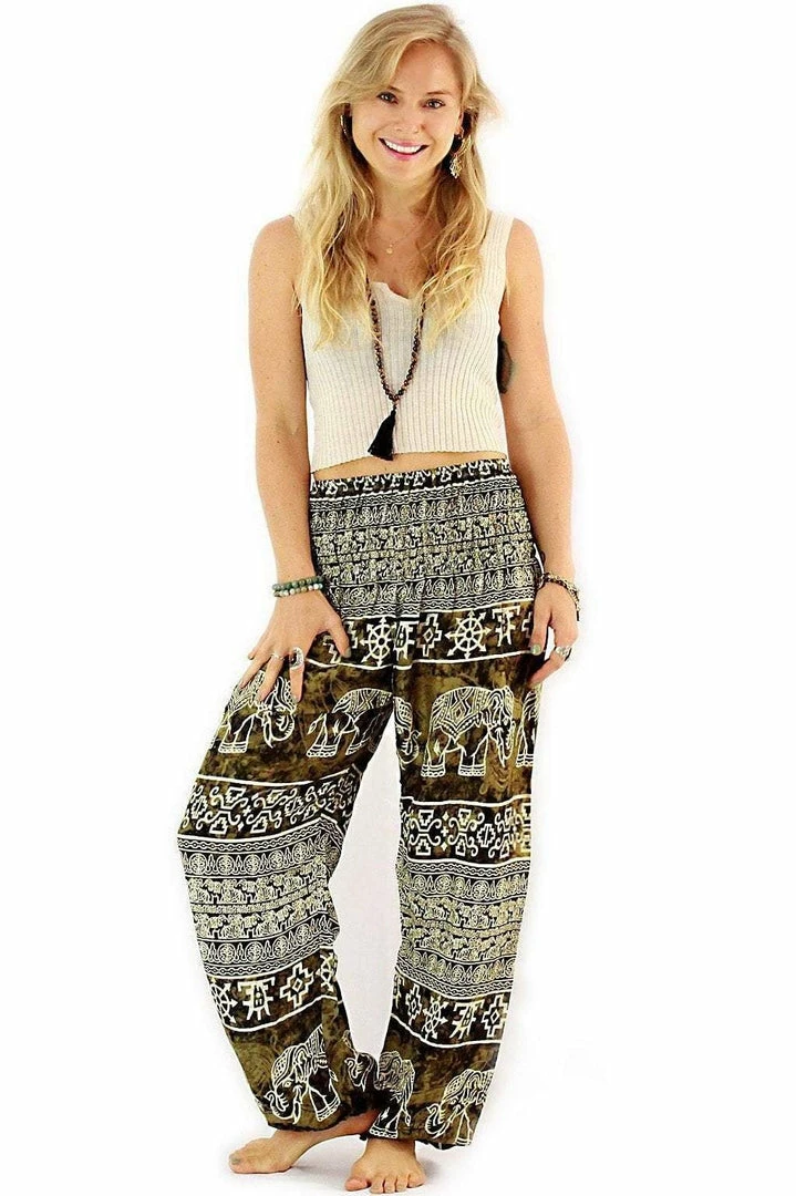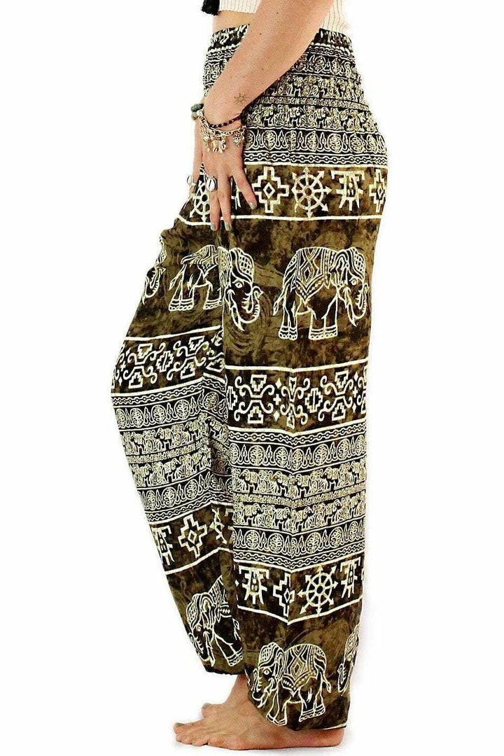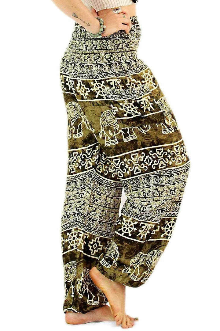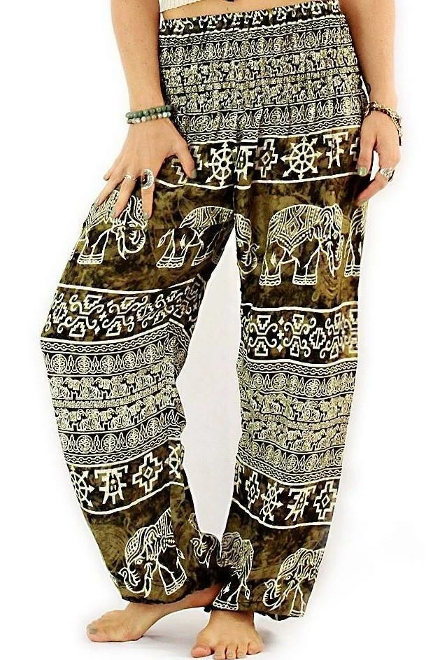 When you’re bored of same old classic black, get these Green elephant pants with the gentle giants running along the stretchy waist and a cute pocket on the side; these Ancient Elephant harem pants are a must have for lovers of elephant pants!