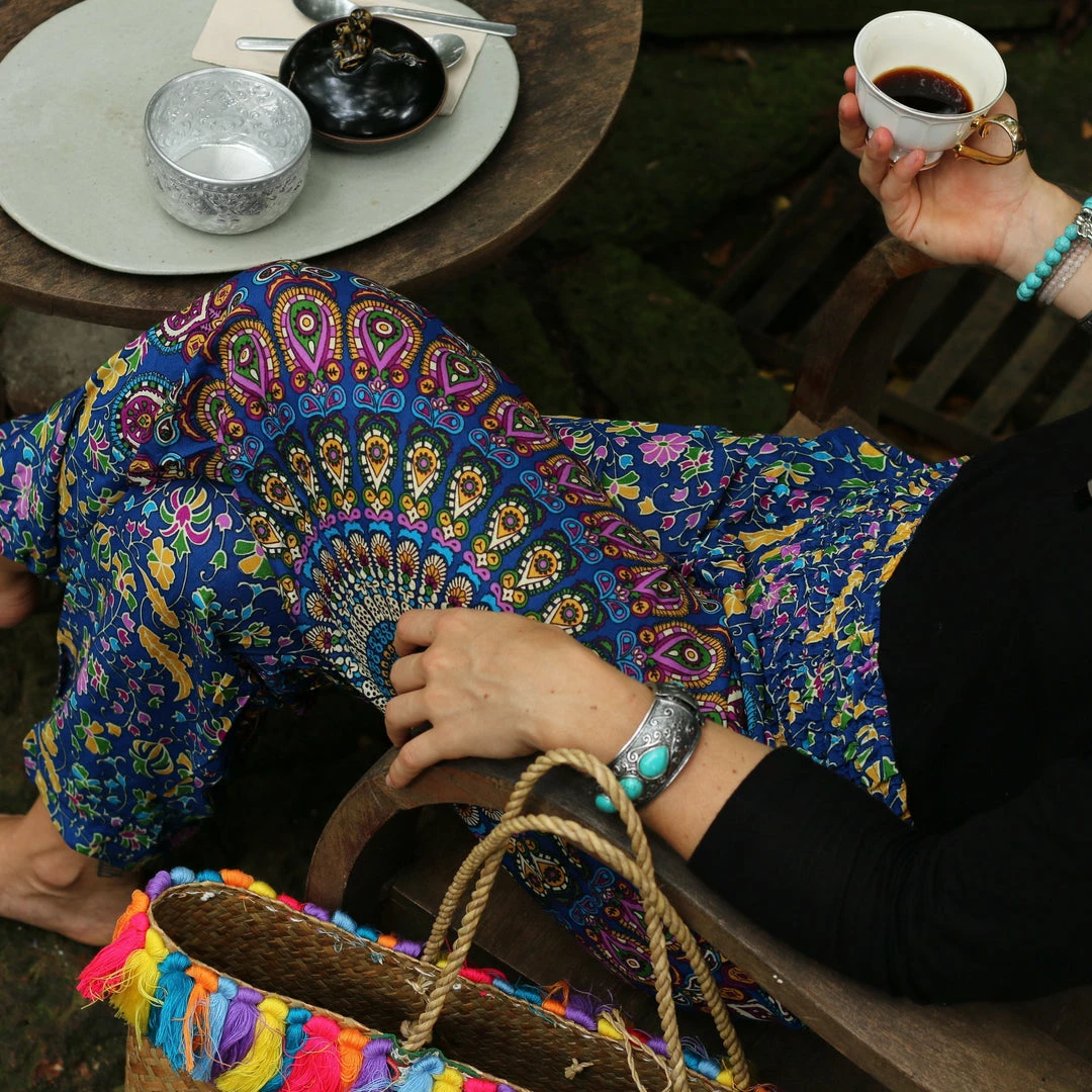 Ground your yoga practice with the bohemian calm exuded by these beautiful pants with feathered chakras down the length that sway and move with your body as you reach your inner peace at a yoga class. These flirty harem pants are also perfect for rocking to music at a fest or throwing caution to the winds as you speed through destinations unknown on your adventures.