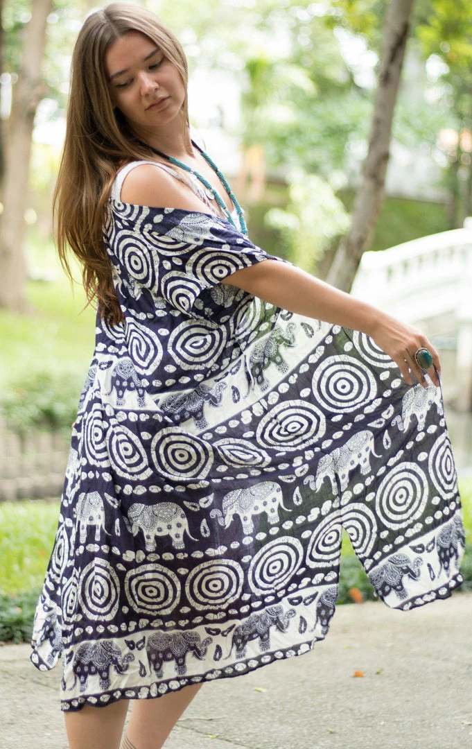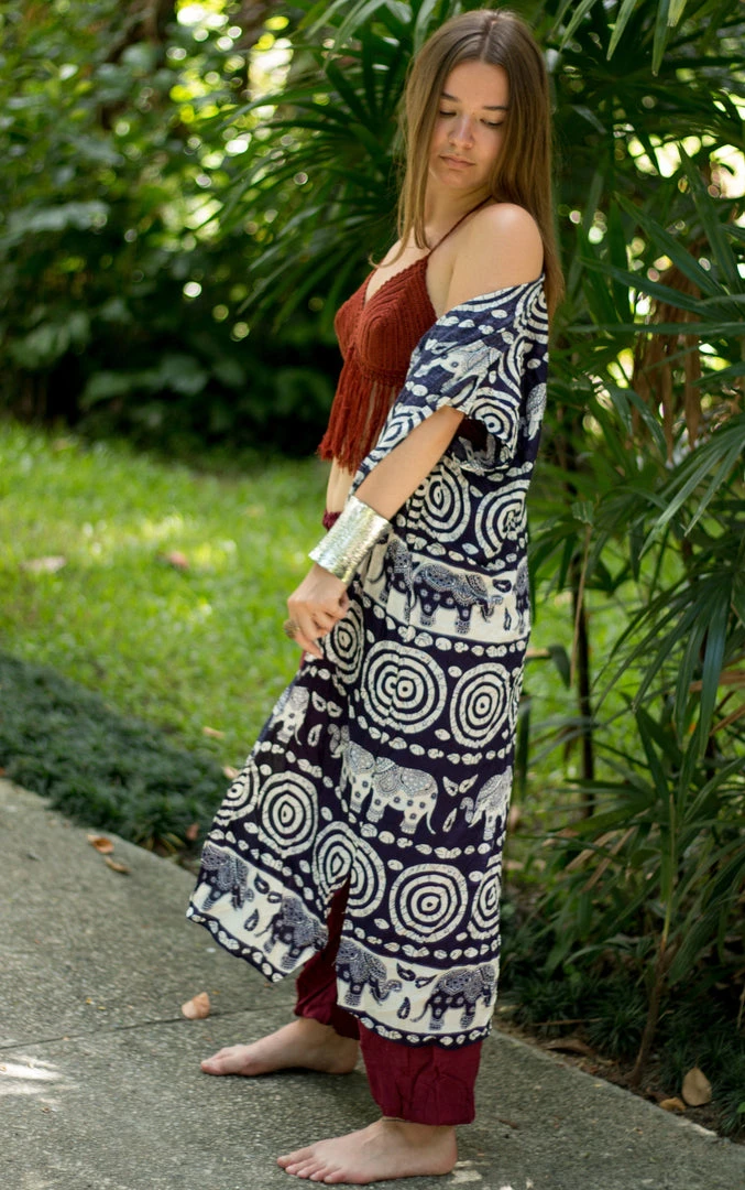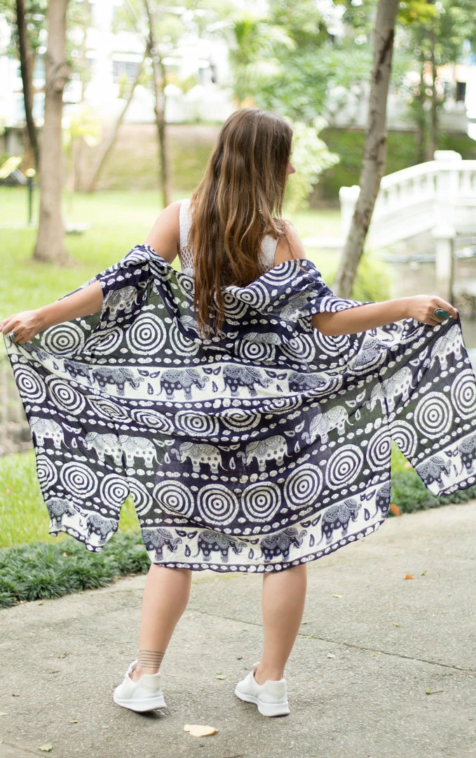 Dedicated to the beautiful elephants in Thailand, this tribal elephant kimono is a classic summer jacket for upping your outfit game when you need some inspiration. Team it with neutrals to make this elephant kimono the center of attention.Â