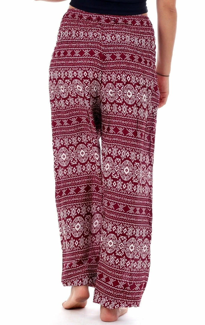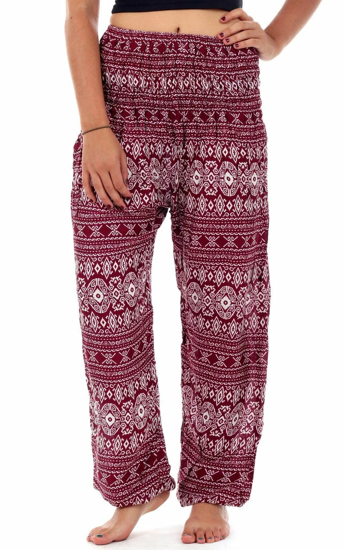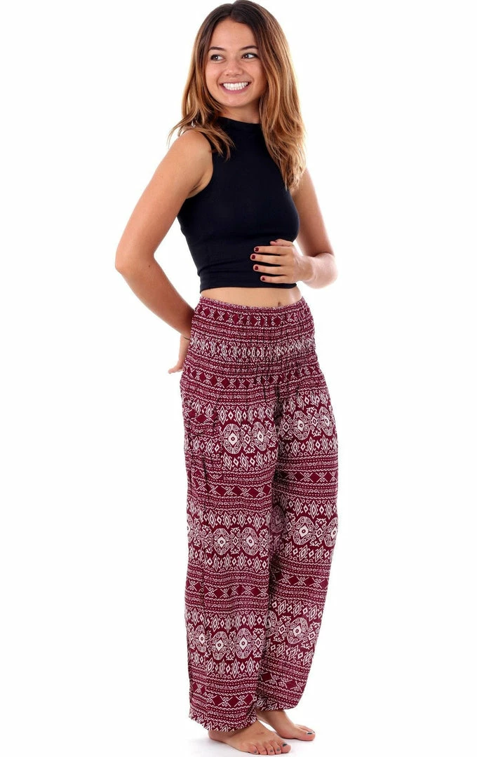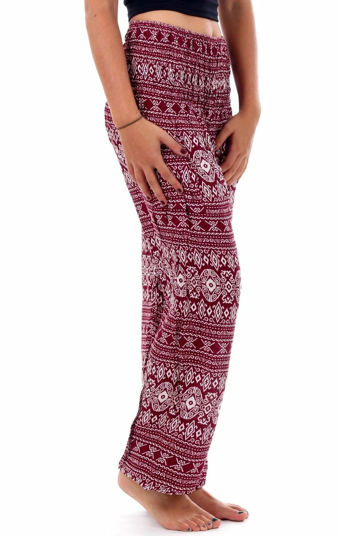 Fight the moody blues of the season in these bright and chic red tribal diamond harem pants that come with a comfortably and stretchy waist complete with a cute side pocket.Â