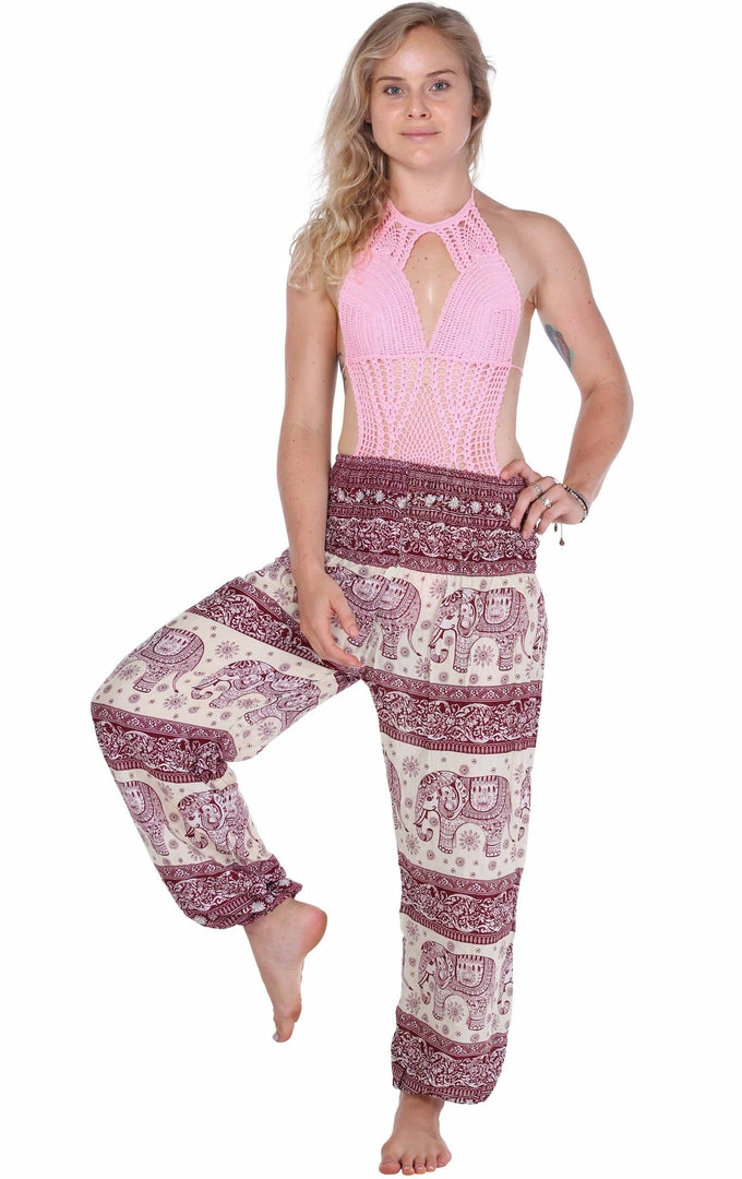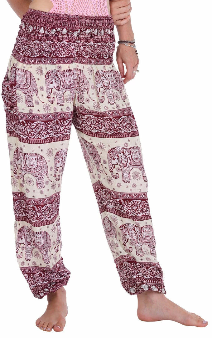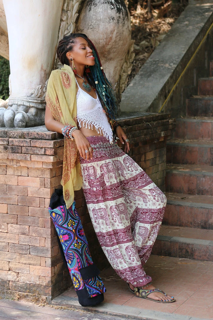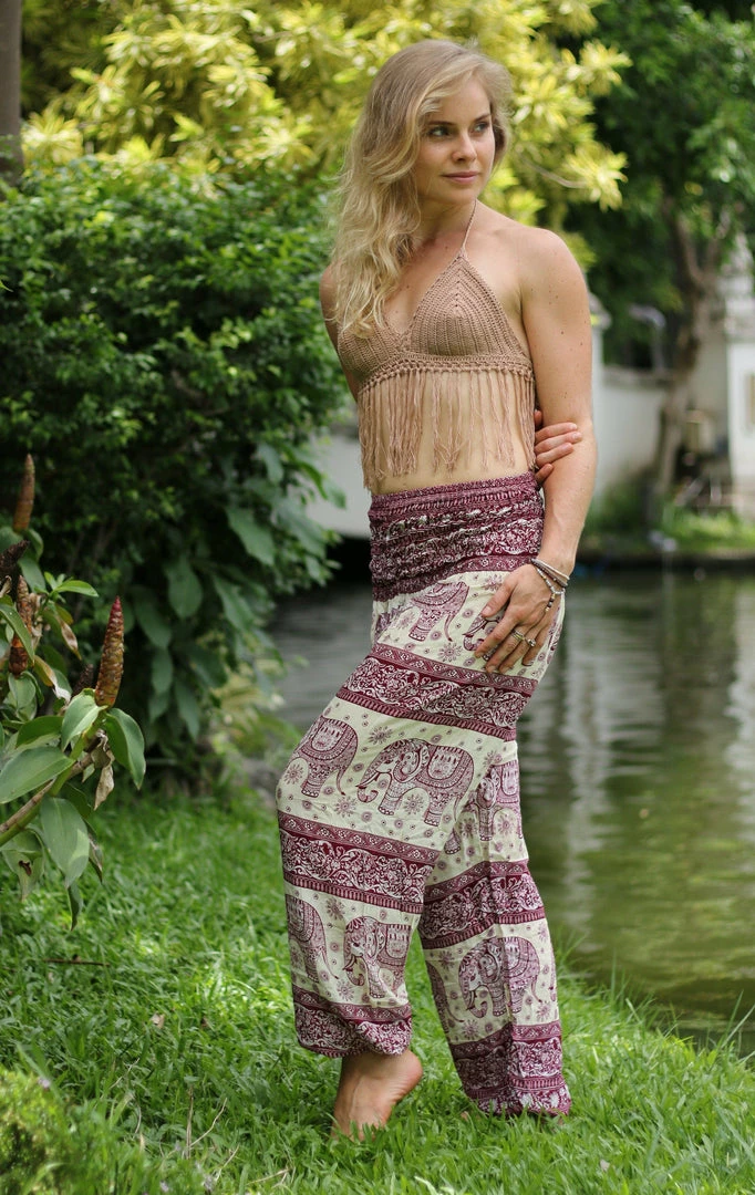 Show the elephant lover you are in these classic elephant harem pants designed with love for the nature and those gentle giants. Coming in a rouge shade, these hippie pants are for those who like their wardrobe full of neutral pastels.