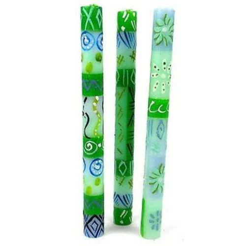 This set of three candles, hand-painted by South African artisans, arrives in a recycled cardboard box. Each candle is 9 inches tall by 0.75 inches in diameter.
