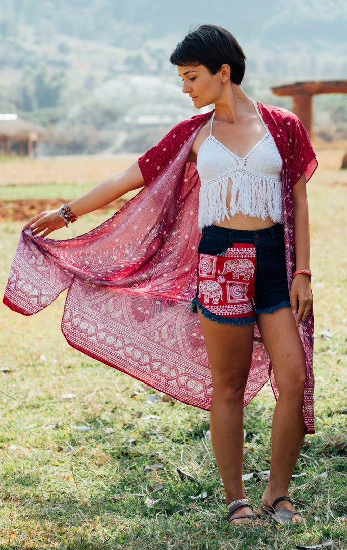 With a striking red print, bearing mighty yet peaceful creatures clad in jewels, these denim shorts are well matched for the sizzle of summer.