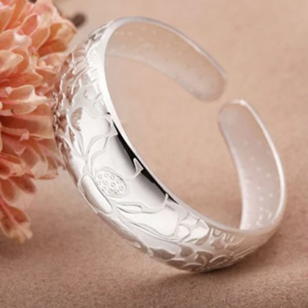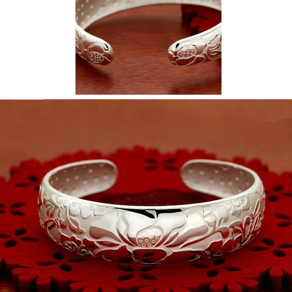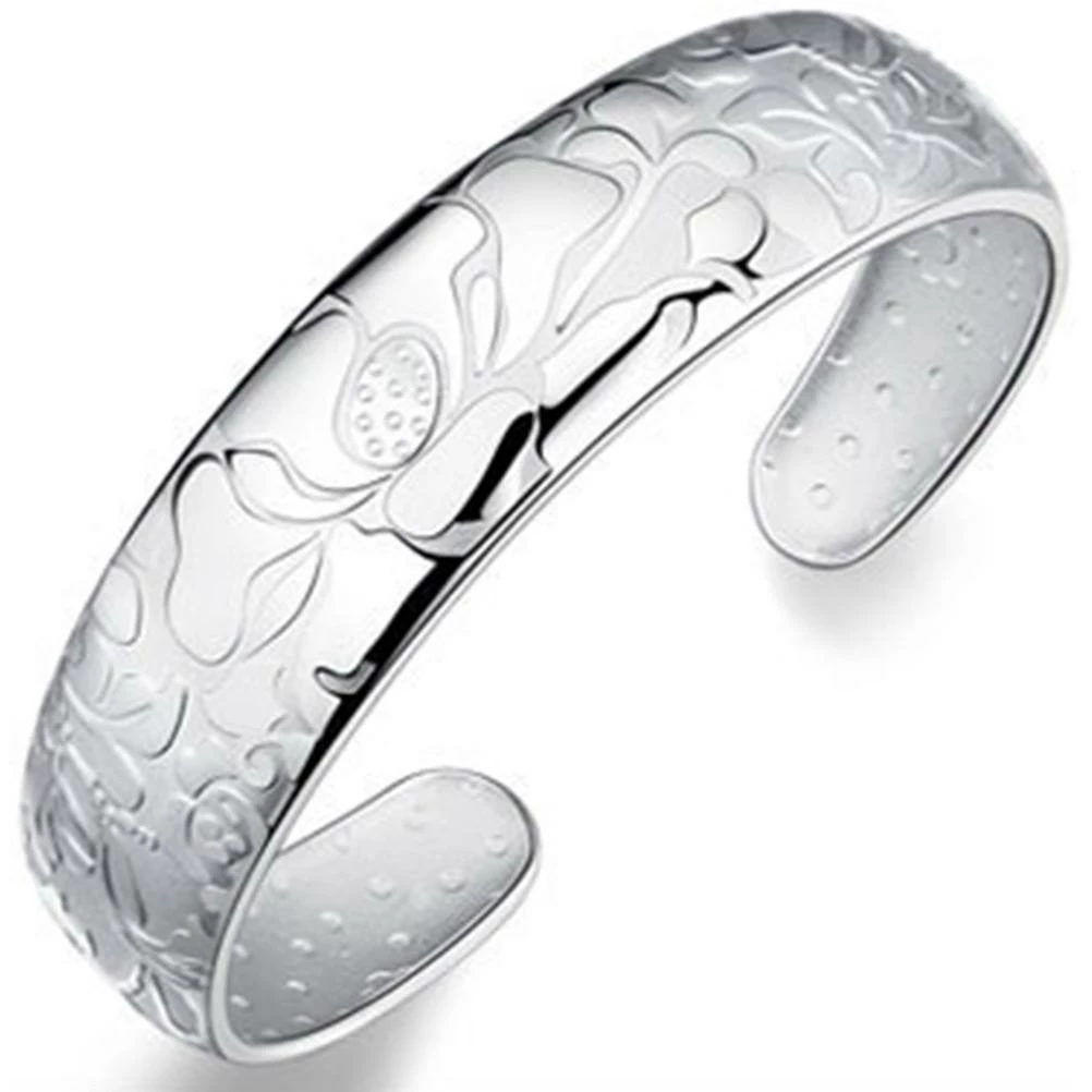 This open lotus carved bangle is a good gift no matter whom you want to send it to. Made of metal alloy, it is soild and wear resistant; carved with lotus pattern and plated with silver, it looks wonderful. It is also eco-friendly, free of nickle and lead, and easy to wear on and put off.