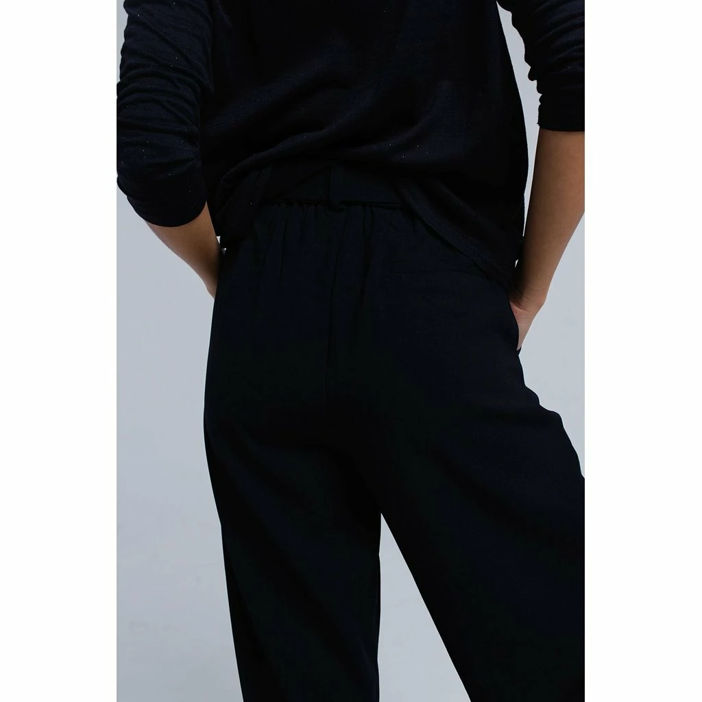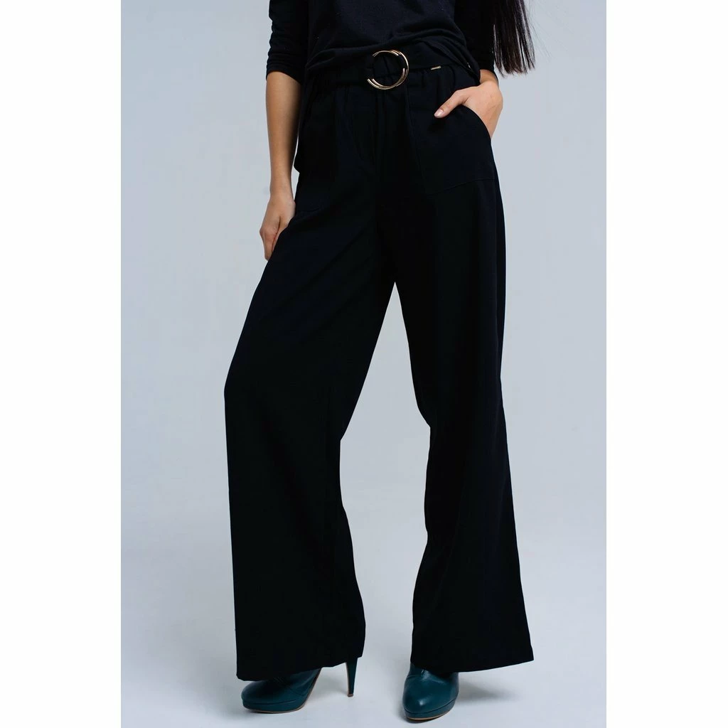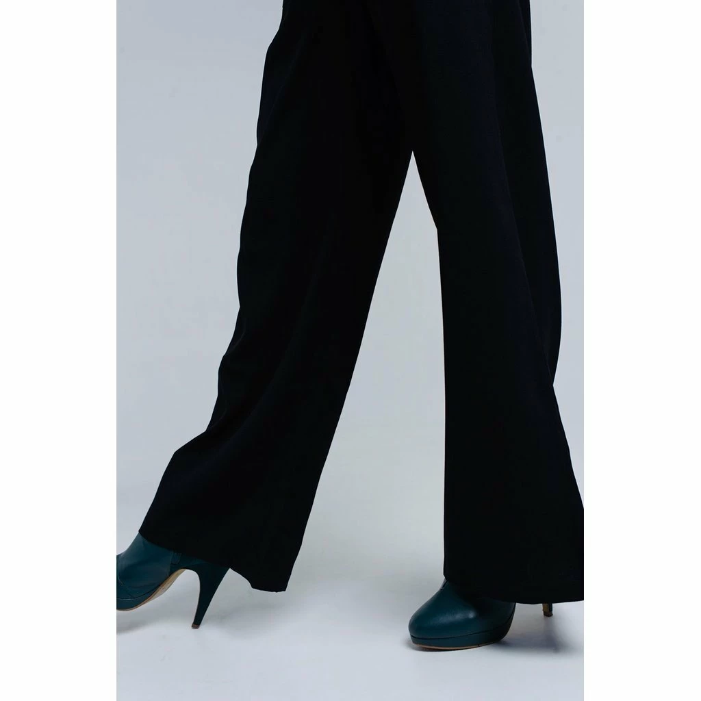Black pants with long wide leg and a pleated detail on the back. Feature an elastic waist with a ribbon belt with two golden buckles in the front, a false pocket in the back and two pockets in the front.