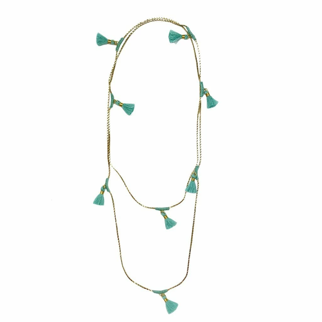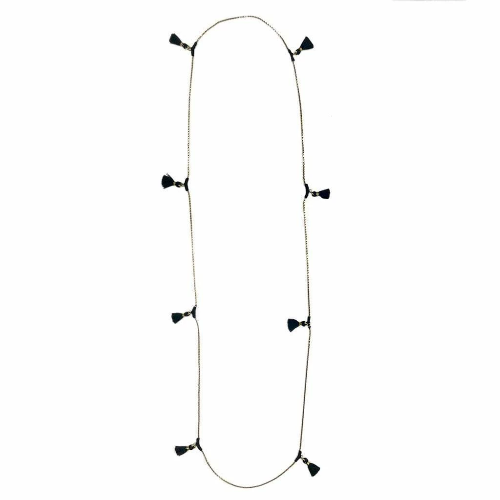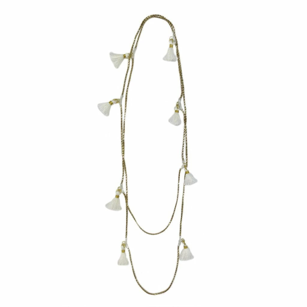 This long versatile necklace is adorned with cotton tassels and can be worn multiple ways. The delicate design is a mix of traditional Indian techniques with modern bohemian.Â