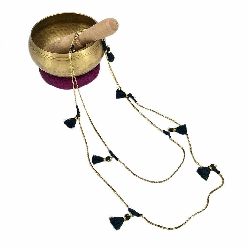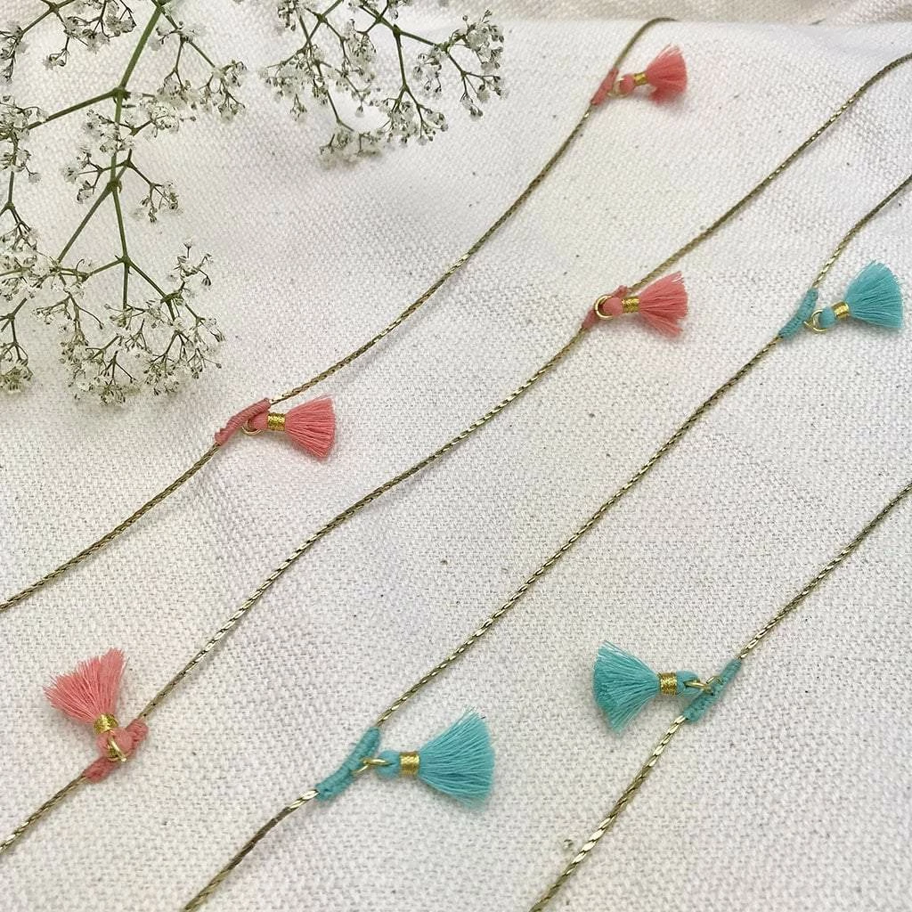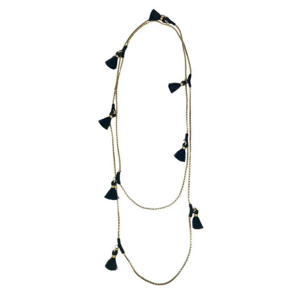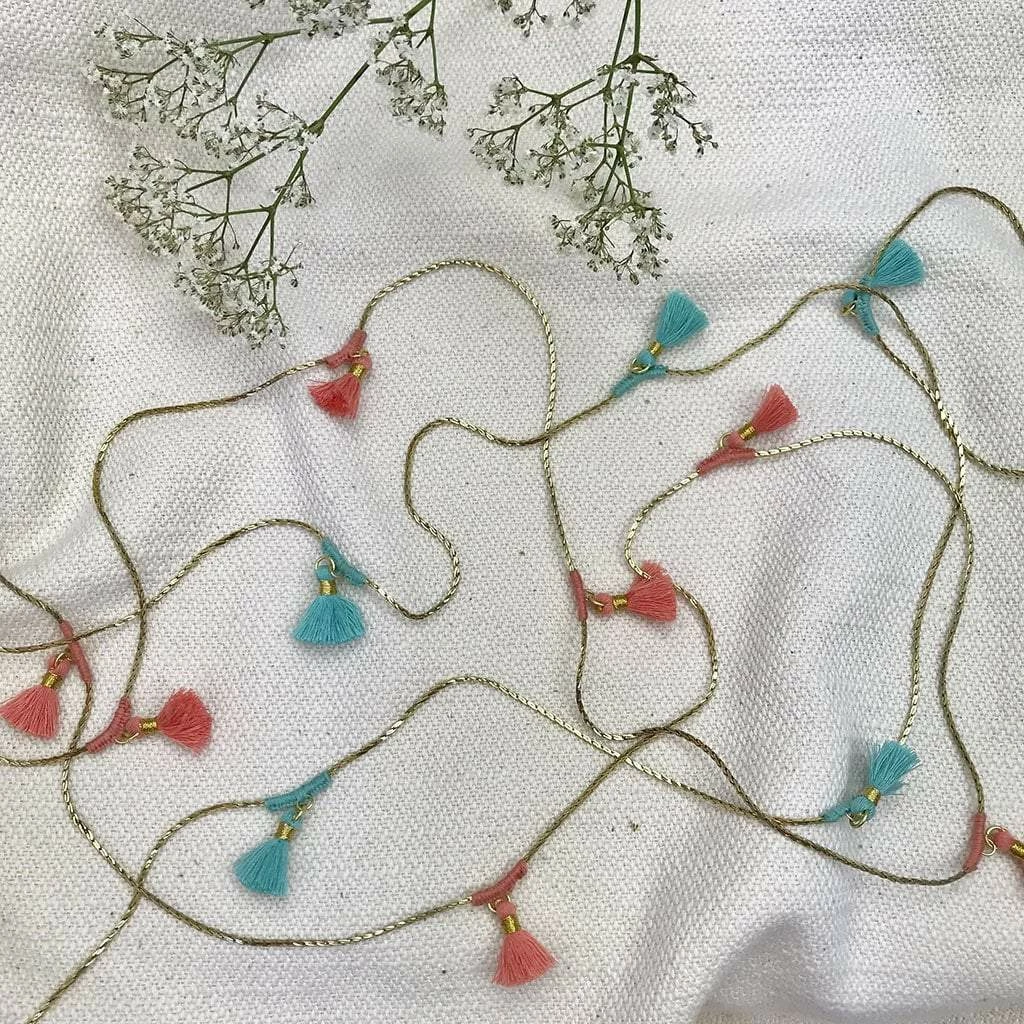 This long versatile necklace is adorned with cotton tassels and can be worn multiple ways. The delicate design is a mix of traditional Indian techniques with modern bohemian.Â