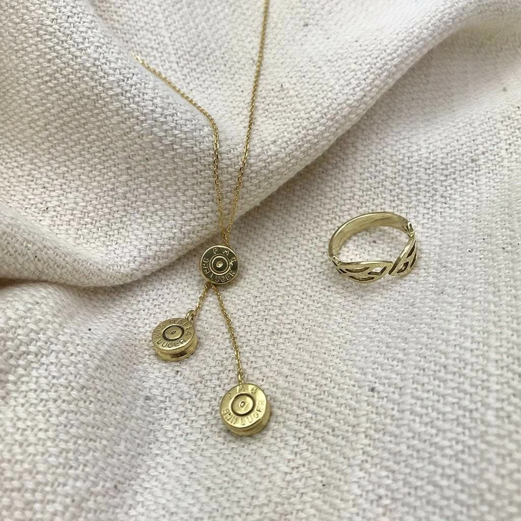 - Material: Recycled brass bombshell & bullet fragments + Gold plated chain