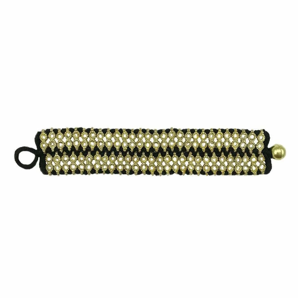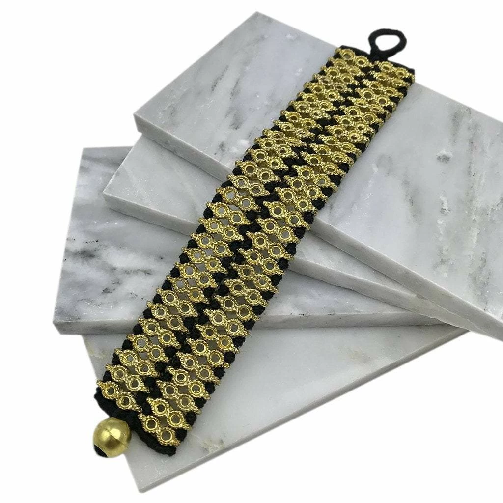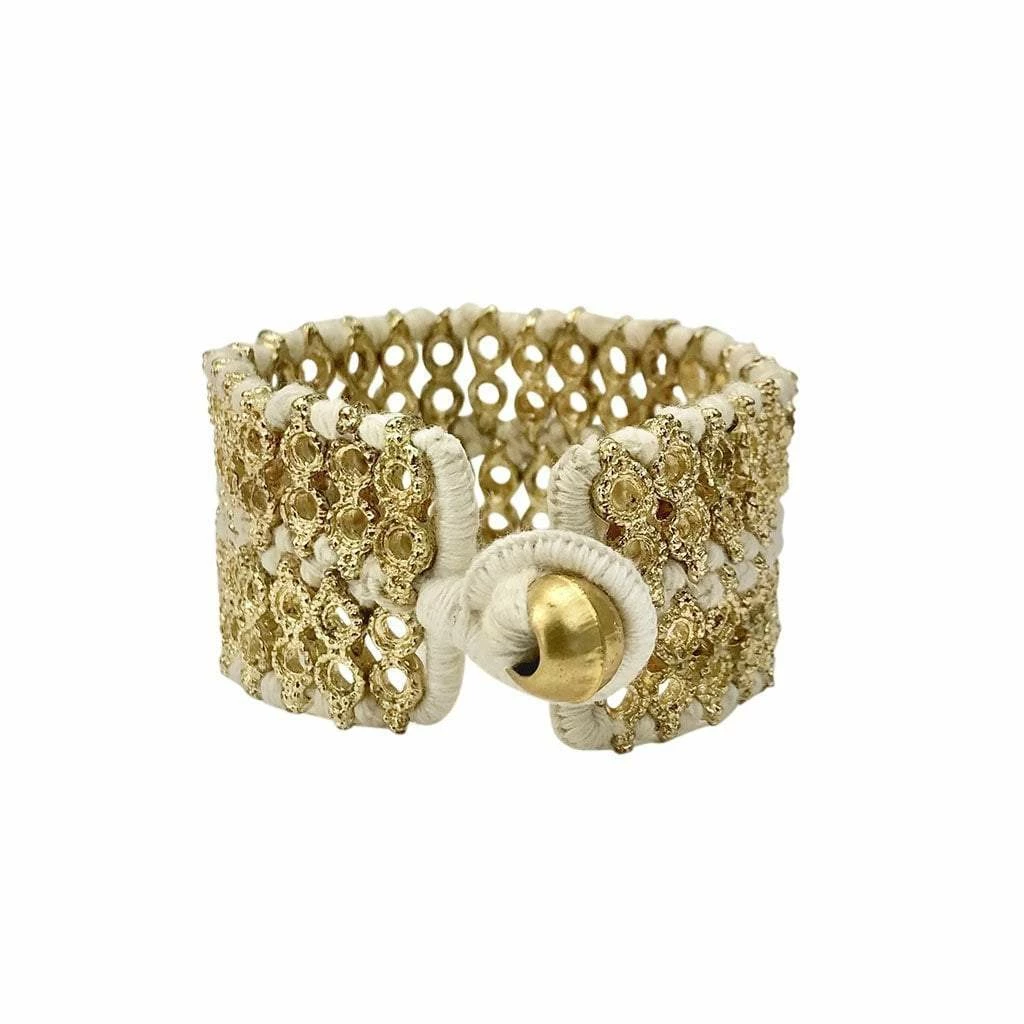 The bold Riya Cuff is anything but understated. The playful motif is created with intricate handwoven metal beads and cotton thread. The perfect statement accessory for day to night and combines traditional Indian designs with modern elegance.