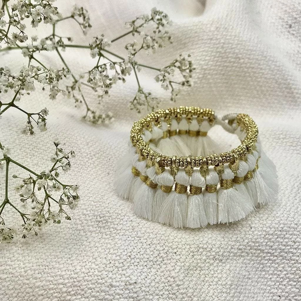The bold Kyra Cuff is anything but understated. The playful motif is created with intricate, handwoven metal beads and cotton tassels. The perfect accessory for day to night and combines traditional Indian designs and modern bohemian.