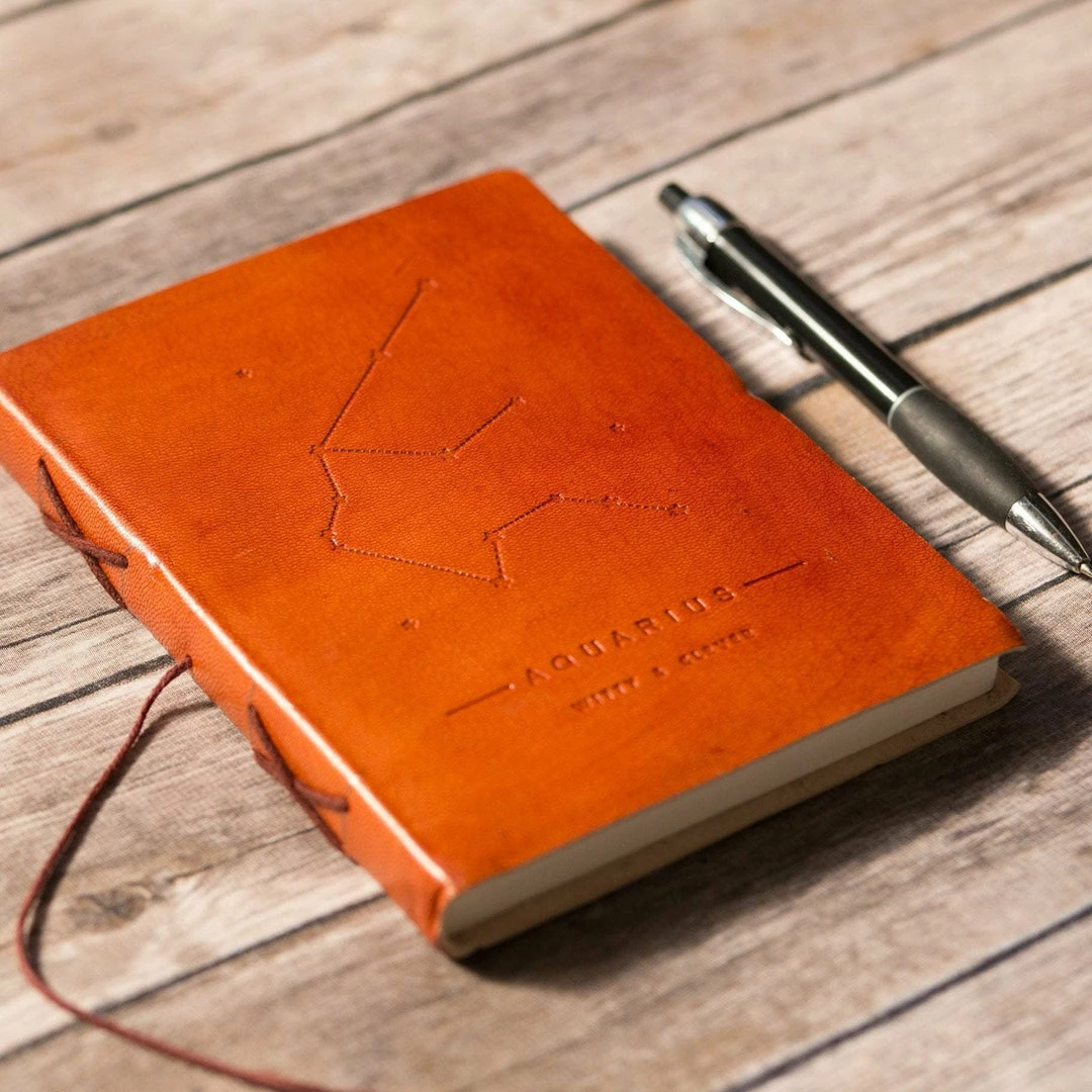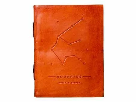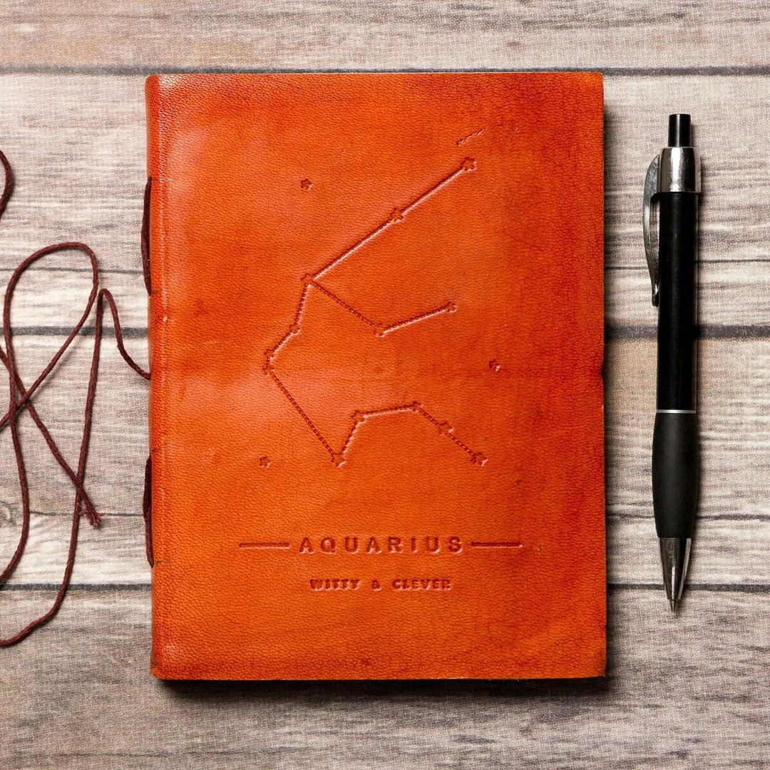 Genuine leather journal embossed with the Aquarius astrological zodiac symbol and the words “witty and clever.” The journal is encased in a rich brown leather cover with a string tie closure and stitched in paper, giving it an old world feel.